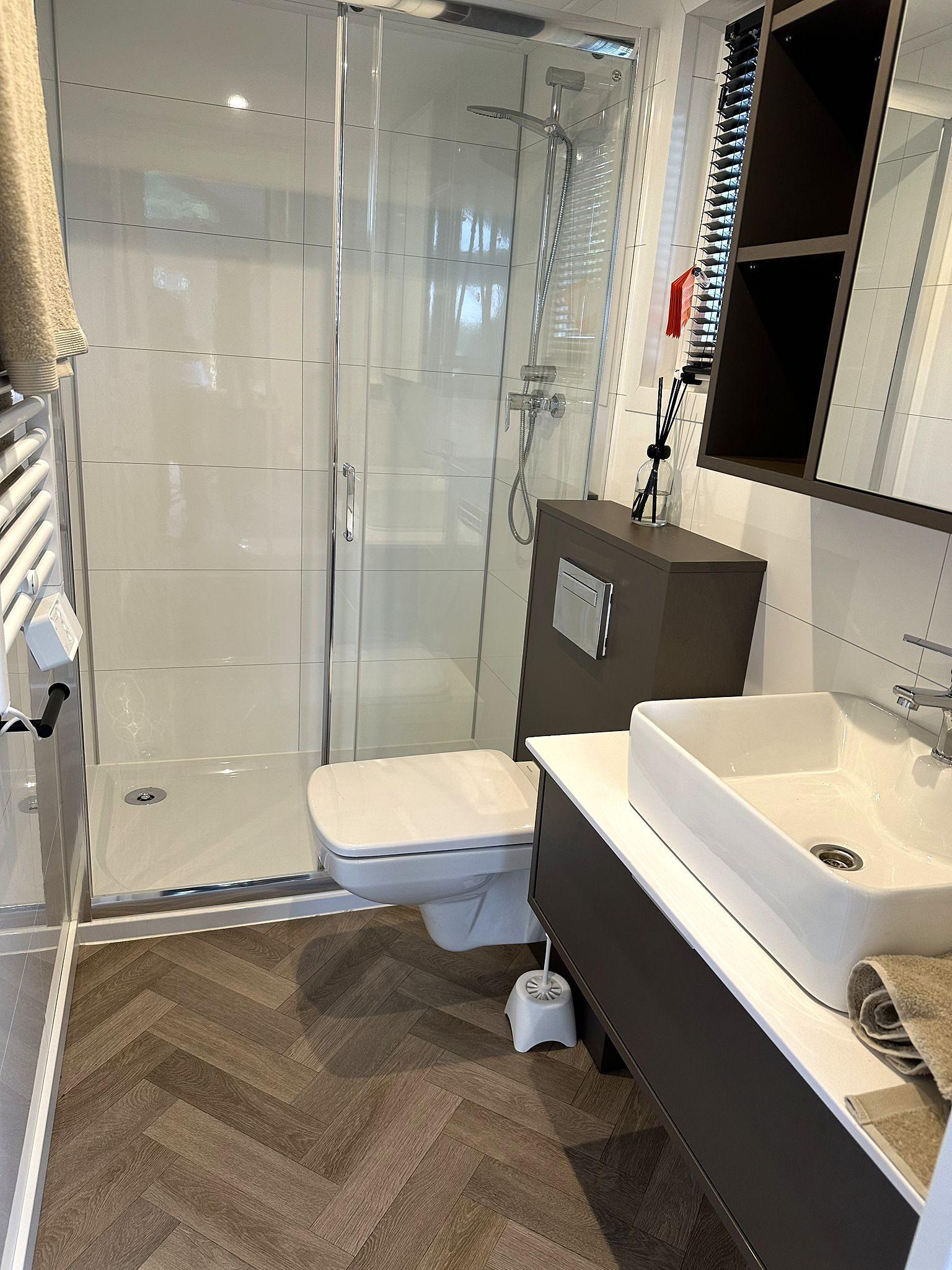 De riante en modern afgewerkte badkamer van de Forrest Lodge is voorzien van stijlvolle, 100% waterdichte Trespa wandpanelen. U geniet hier van het comfort van een ruime inloopdouche, toilet, een wastafel met meubel en een praktische spiegelkast. De designradiator zorgt voor aangename warmte, terwijl de mechanische ventilatie en het draai-/kiepraam zorgen voor een fris en gezond binnenklimaat. Een comfortabele en onderhoudsvriendelijke ruimte om elke dag ontspannen te beginnen.