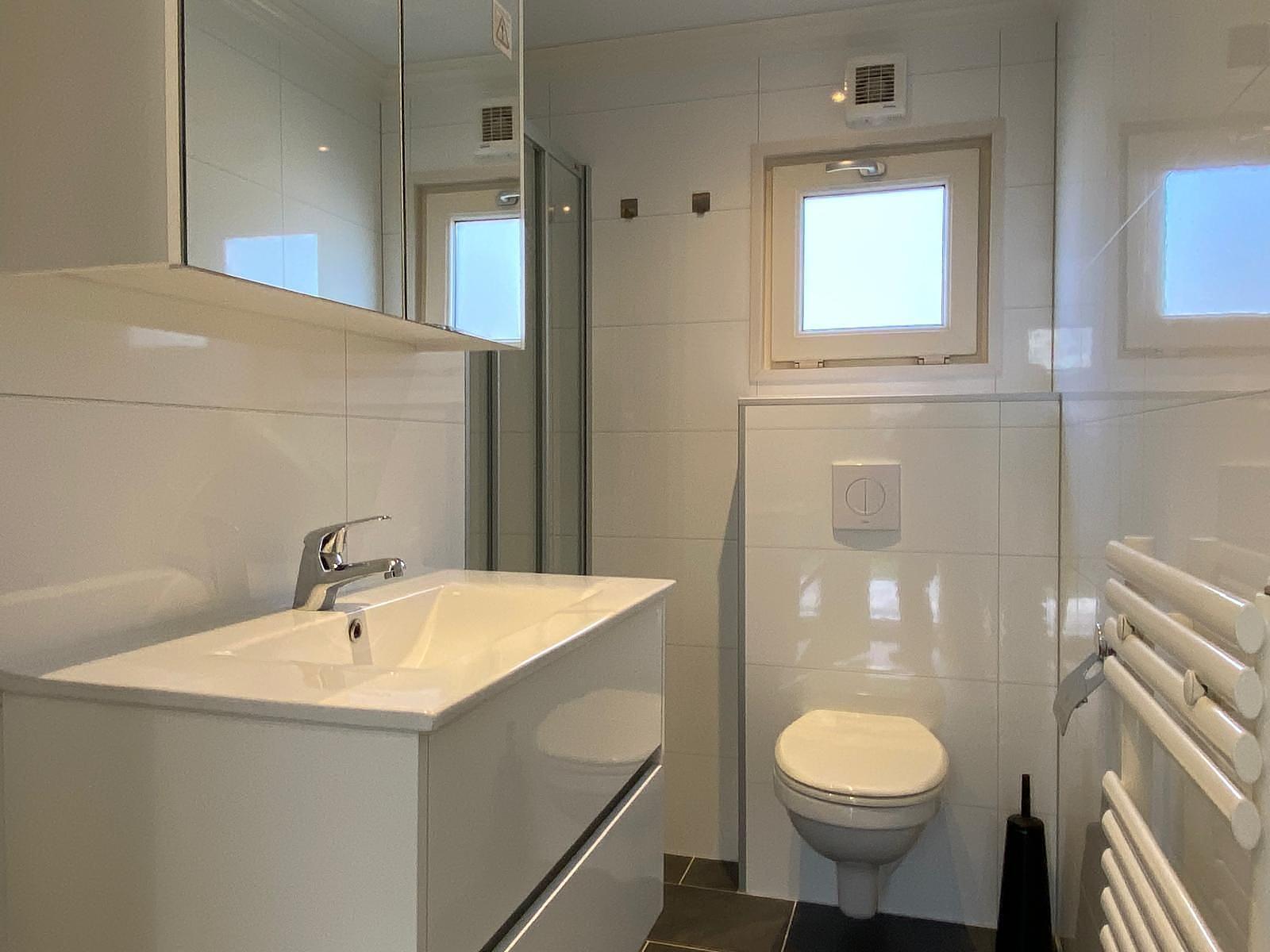 De ruime badkamer is compleet ingericht en is voorzien van een ruime douche , een zwevend toilet , badkamermeubel voorzien van verschillende laden en kastjes inclusief een grote spiegel en een wasbak en er is een design radiator aanwezig.