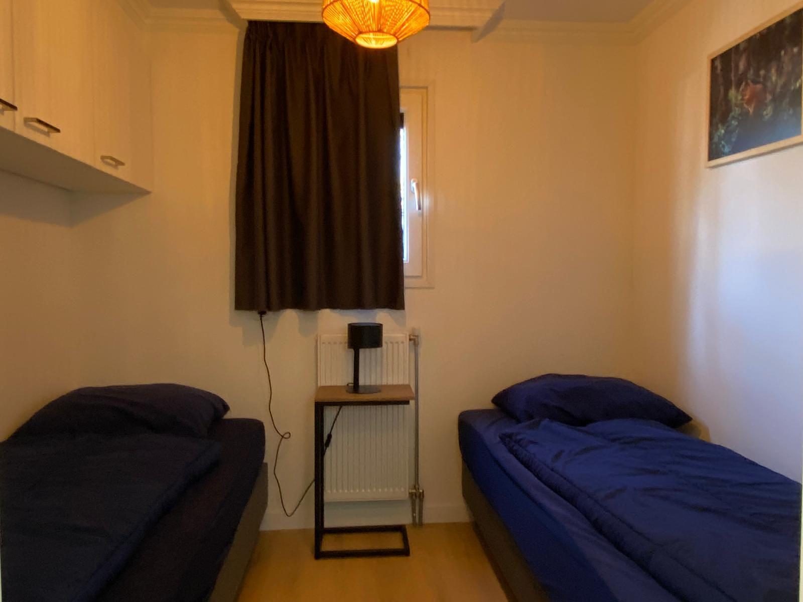 De gasten/kinderen slaapkamer / werkkamer bied plaats aan 2 éénpersoons bedden en er zijn kleding/opberg kasten aanwezig.