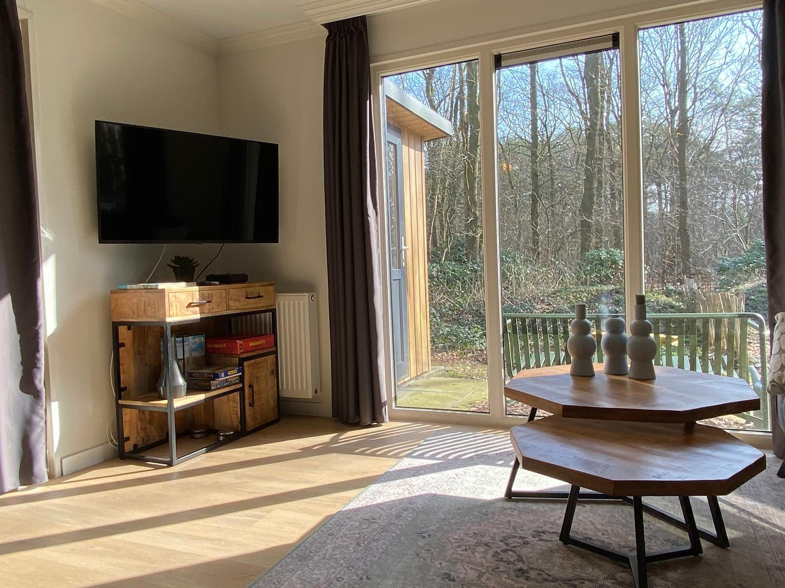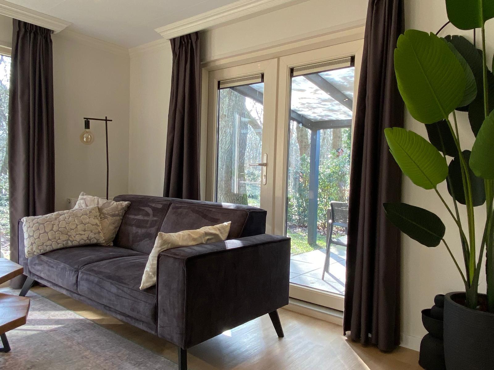 De ruime woonkamer is voorzien van grote raampartijen en te open of te sluiten terrasdeuren.