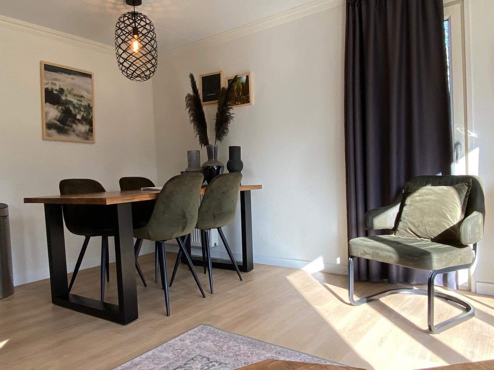 Er zijn geen drempels aanwezig in het vakantiehuis en de vloer is bedekt met houtlook PVC laminaat vloer.