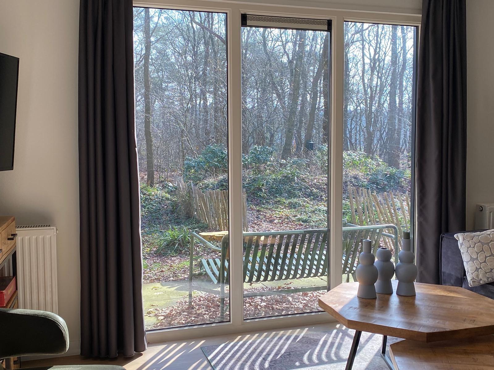 Het vakantiehuis 44m2 bouwjaar 2023 heeft grote raampartijen met dubbel glas, waardoor er veel natuurlijk licht binnenvalt.