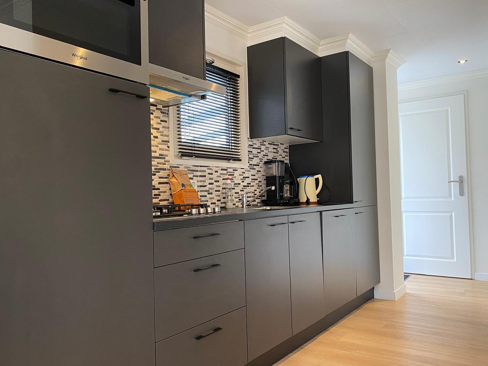 De luxe keuken is compleet uitgerust en is voorzien van een grote koelkast met apart vriesvak , 2 in 1 magnetron en oven , kookplaat met afzuigsysteem en alle lades en kastdeuren hebben een zacht stop systeem.