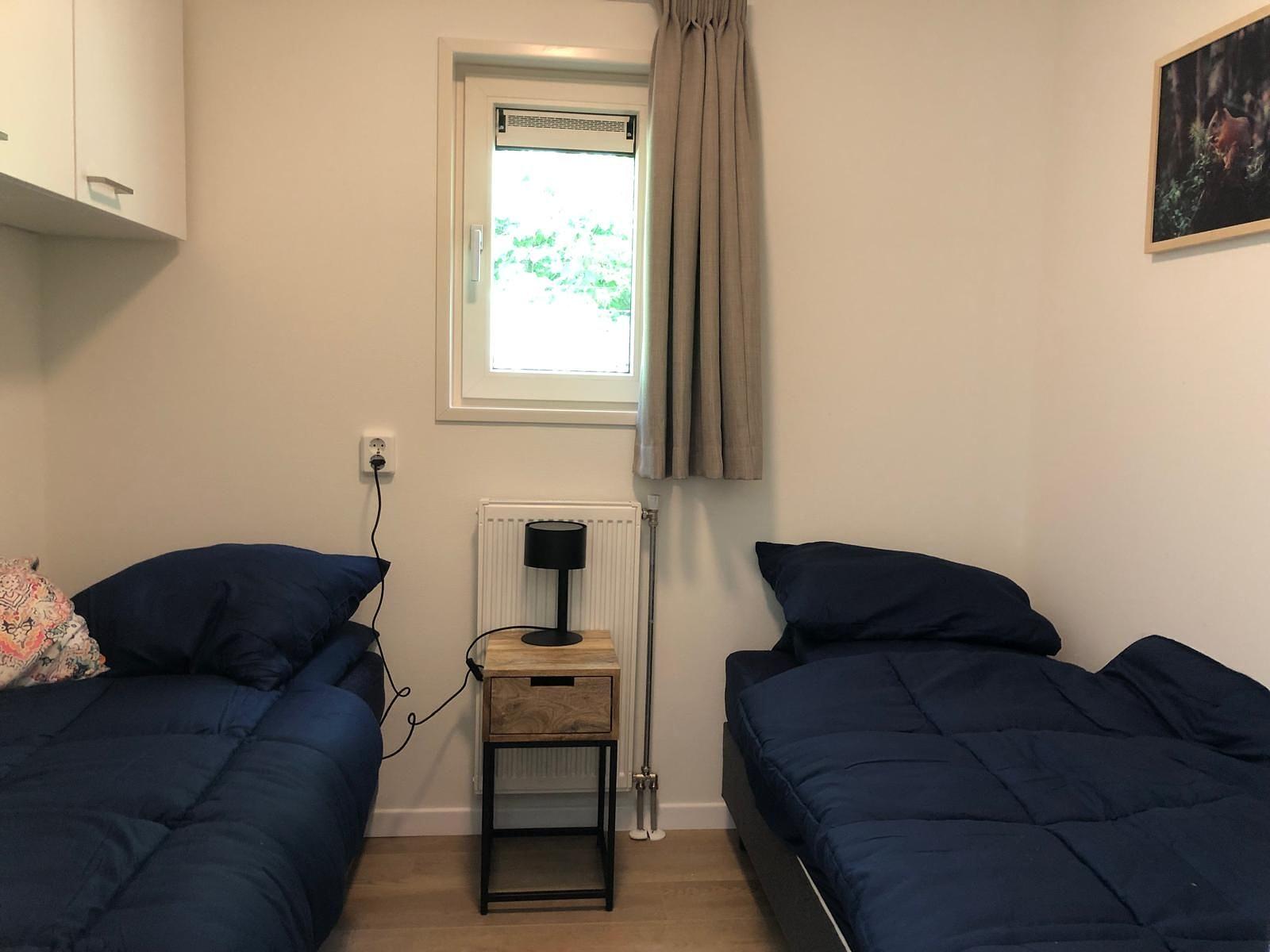 De gasten/kinderslaapkamer is onder andere voorzien van verschillende opberg en kast ruimte en bied plaats aan 2 aparte bedden of een stapelbed .