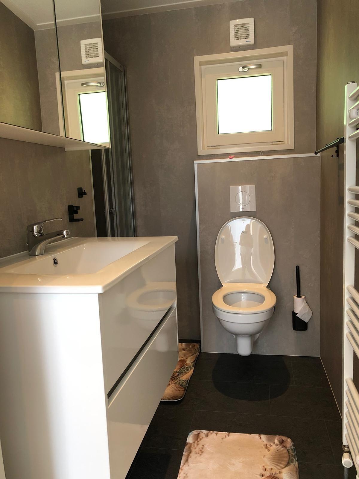 De luxe badkamer is onder andere voorzien van : een ruime douche cabine, badkamer meubel Incl. spiegel en verschillende opberg gelegenheden.