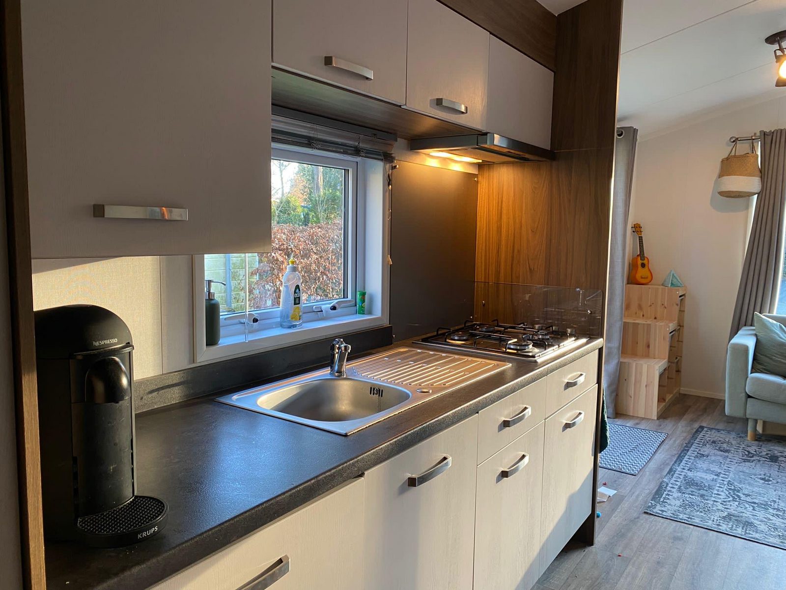 De luxe keuken is onder andere voorzien van een grote koelkast met aparte diepvriezer, kookplaat met afzuigkap, 2 in 1 oven en alle lades en kasten hebben een zacht stop systeem.