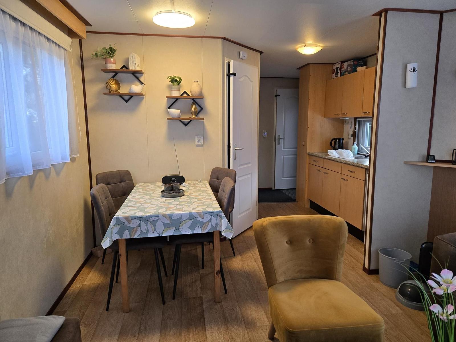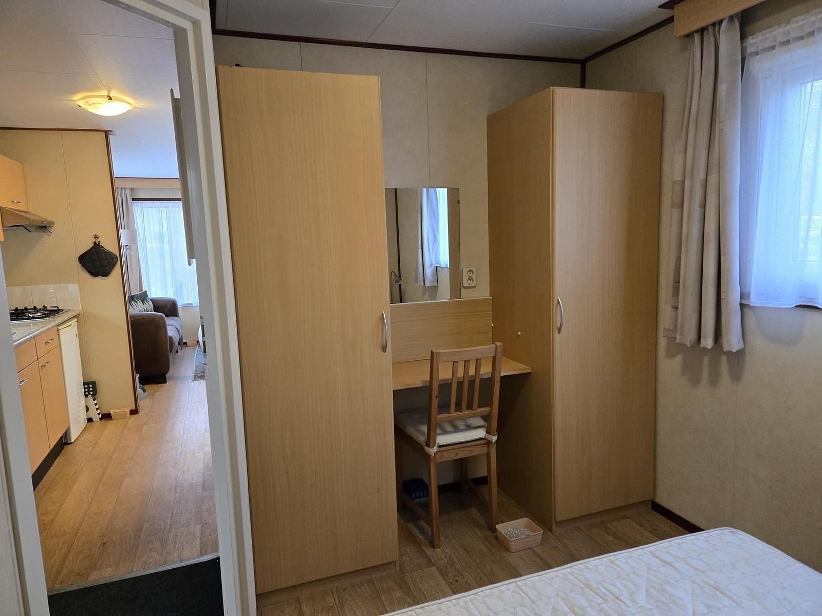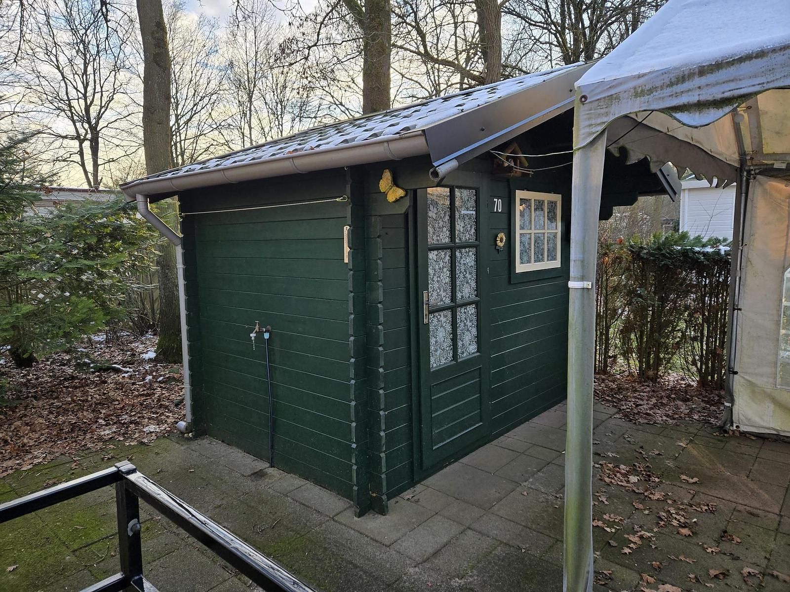Entree. Woonkamer met losse meubelen en tuindeuren naar het terras. Keuken (4-pits kookplaat, afzuigkap, spoelbak en koelkast). Slaapkamer met tweepersoonsbed, vaste kasten en kaptafel. 2e slaapkamer met stapelbed. Badkamer met douchecabine, wasbak, toilet en afzuiging. Kunststof kozijnen. Verwarming middels elektrische kachel, warm water middels geiser. Tuinhuisje en partytent aanwezig. Vloer voorzien van vinyl. In dit chalet mag gerecreëerd worden van 1 april t/m 15 oktober. de prijs is inclusief het stageld van 2026.