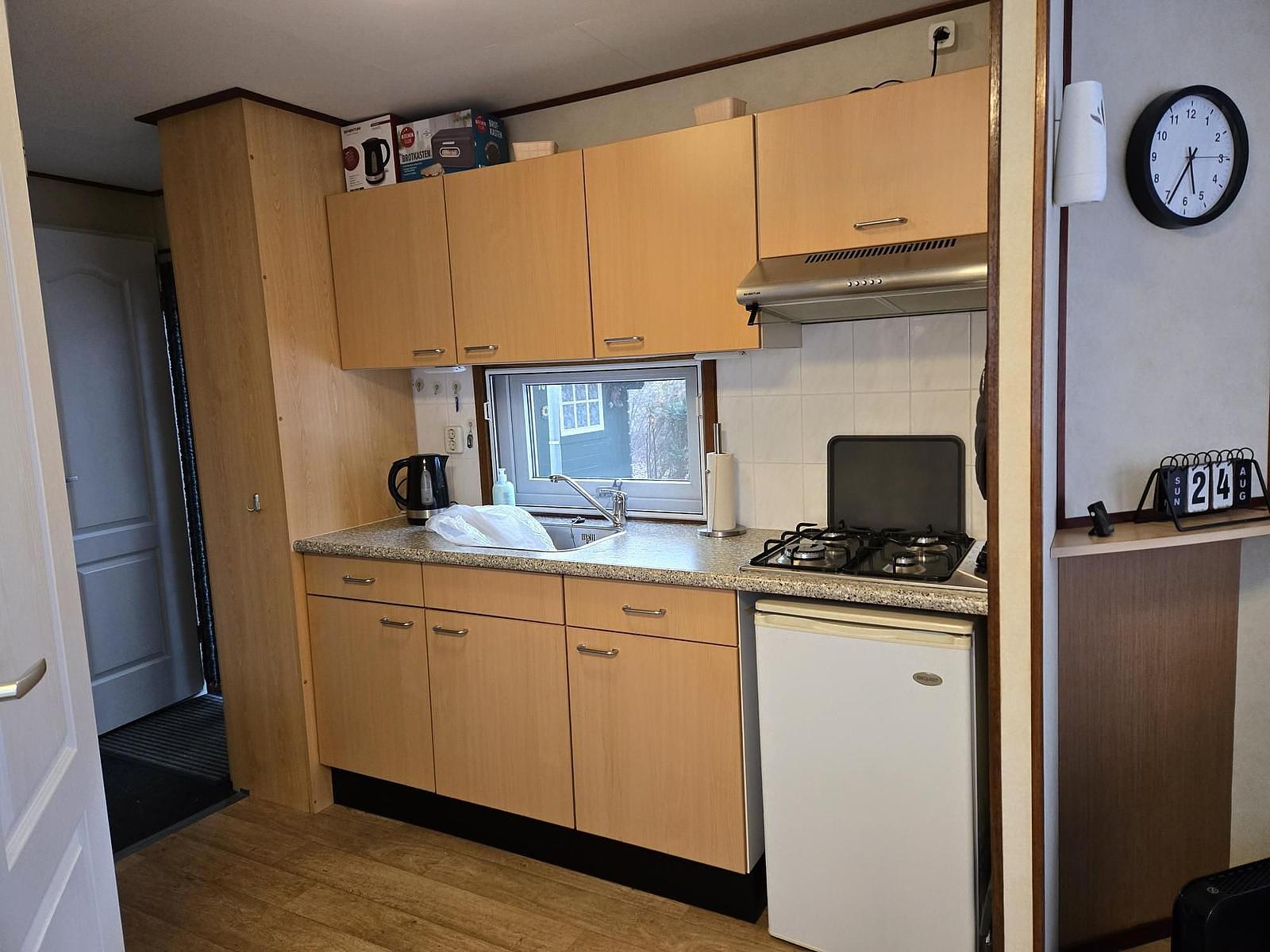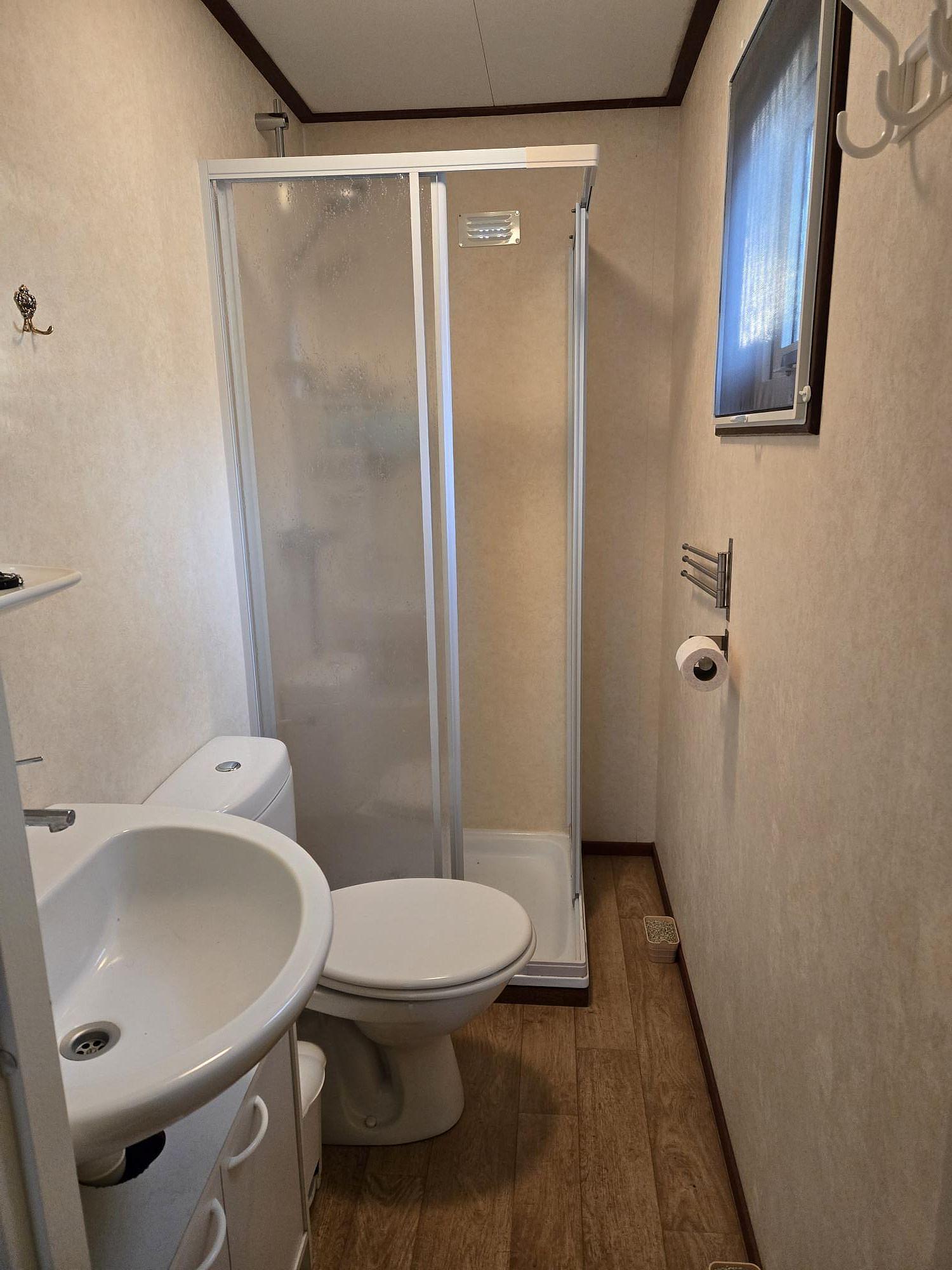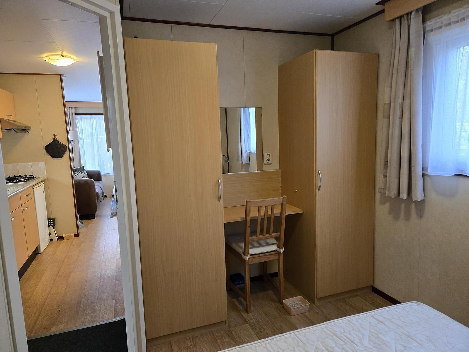 Entree. Woonkamer met losse meubelen en tuindeuren naar het terras. Keuken (4-pits kookplaat, afzuigkap, spoelbak en koelkast). Slaapkamer met tweepersoonsbed, vaste kasten en kaptafel. 2e slaapkamer met stapelbed. Badkamer met douchecabine, wasbak, toilet en afzuiging. Kunststof kozijnen. Verwarming middels elektrische kachel, warm water middels geiser. Tuinhuisje en partytent aanwezig. Vloer voorzien van vinyl. In dit chalet mag gerecreëerd worden van 1 april t/m 15 oktober. de prijs is inclusief het stageld van 2026.