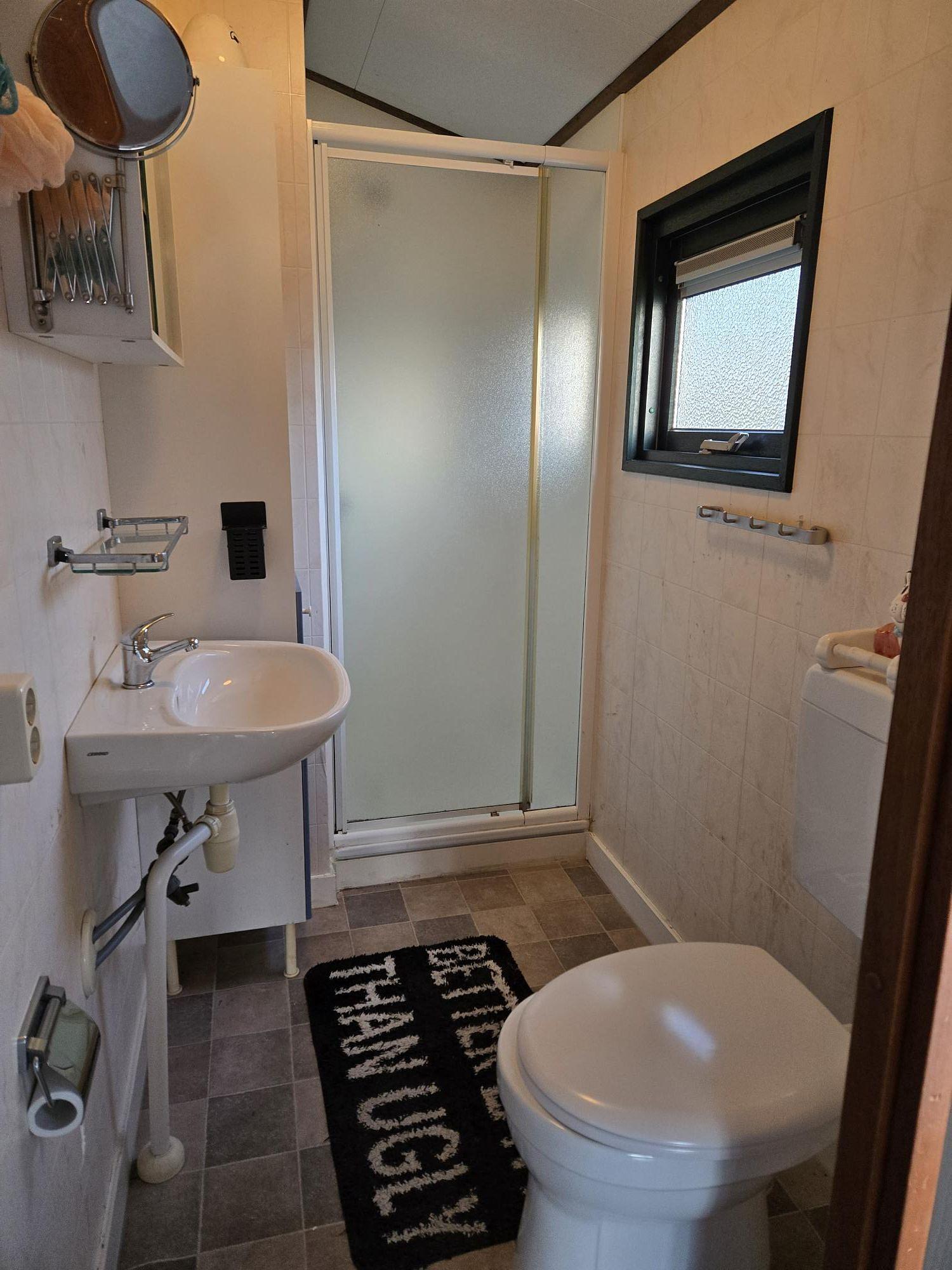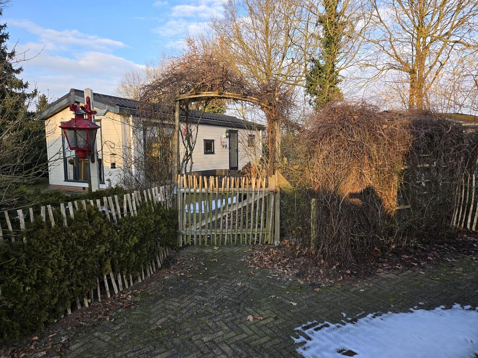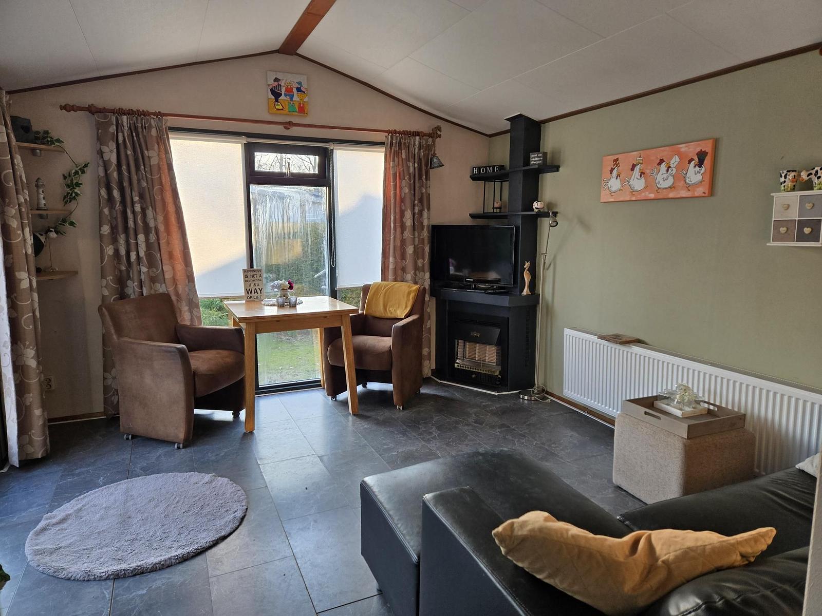 Indeling: Entree. Badkamer met douche (thermostaatkraan), wastafel en toilet. Slaapkamer met een 2-persoonsbed en vaste kasten. Slaapkamer met 2 eenpersoonsbedden. Woonkamer met bankstel, eettafel met stoelen en openslaande deuren naar het terras. Keuken met 4- pits gasfornuis, afzuigkap, spoelbak, koelkast. Plavuizen in de woonkamer, Vloerbedekking in de ouderslaapkamer. Novilon in de 2e slaapkamer. Verwarming en warm water middels cv-ketel. Tuinhuisje met luifel en eigen parkeerplaats. Veel privacy.