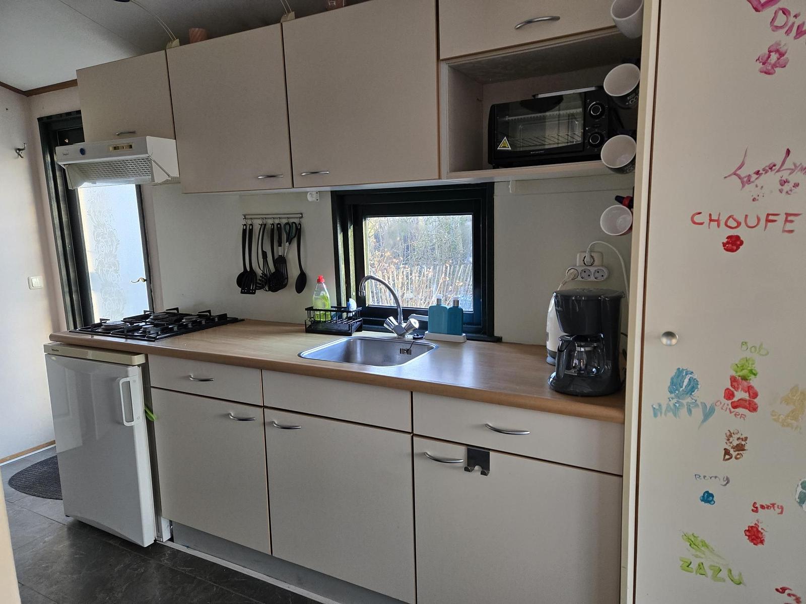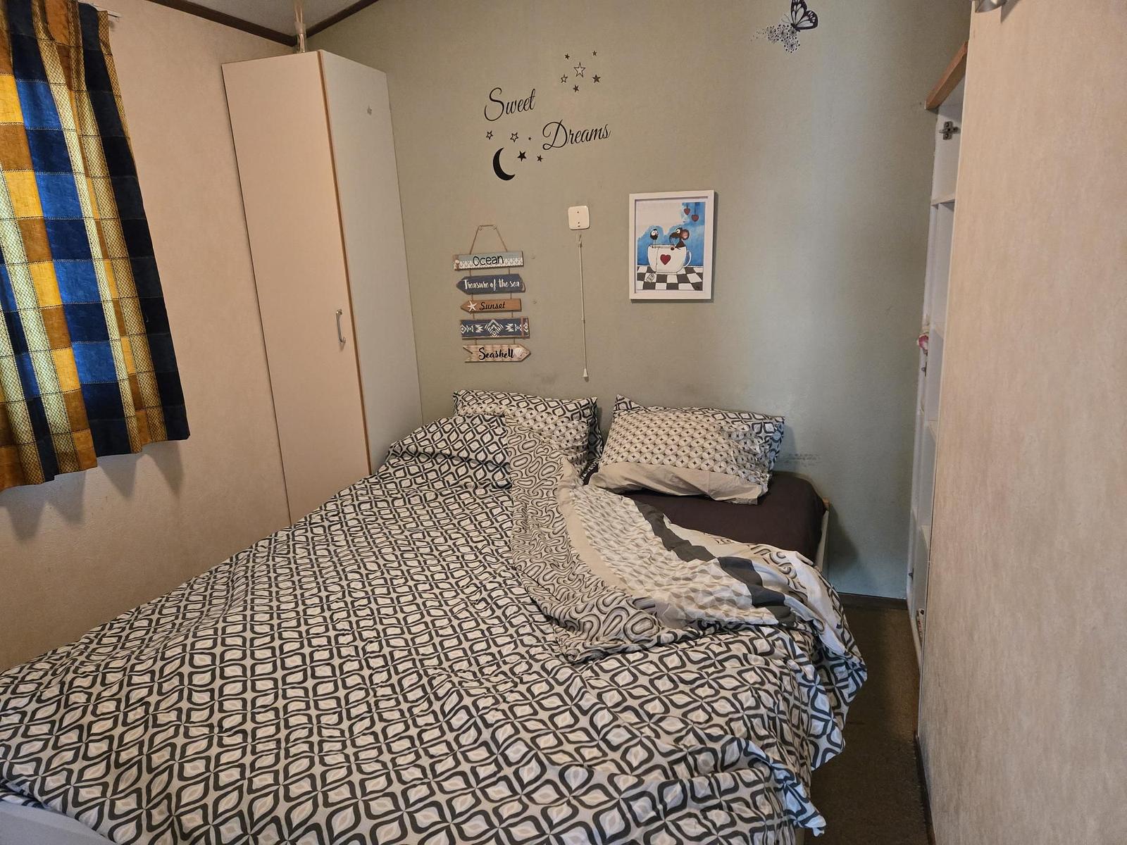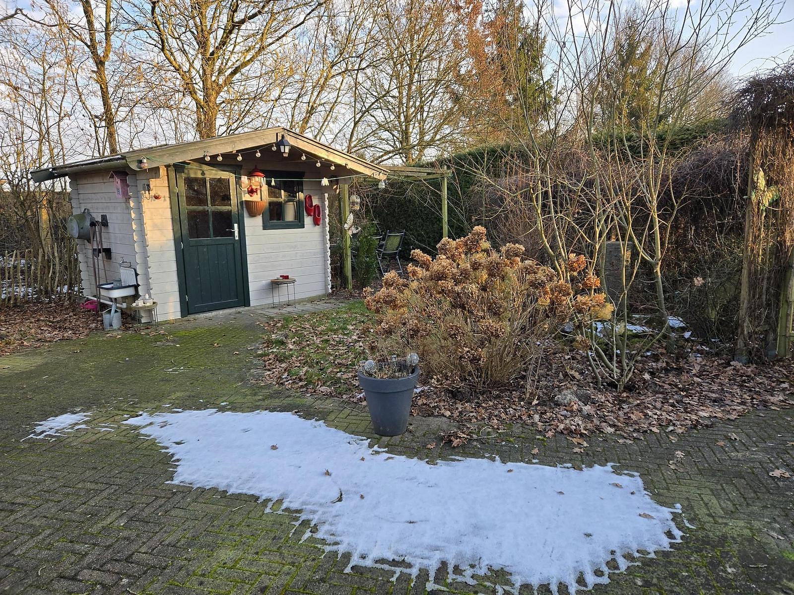 Indeling: Entree. Badkamer met douche (thermostaatkraan), wastafel en toilet. Slaapkamer met een 2-persoonsbed en vaste kasten. Slaapkamer met 2 eenpersoonsbedden. Woonkamer met bankstel, eettafel met stoelen en openslaande deuren naar het terras. Keuken met 4- pits gasfornuis, afzuigkap, spoelbak, koelkast. Plavuizen in de woonkamer, Vloerbedekking in de ouderslaapkamer. Novilon in de 2e slaapkamer. Verwarming en warm water middels cv-ketel. Tuinhuisje met luifel en eigen parkeerplaats. Veel privacy.