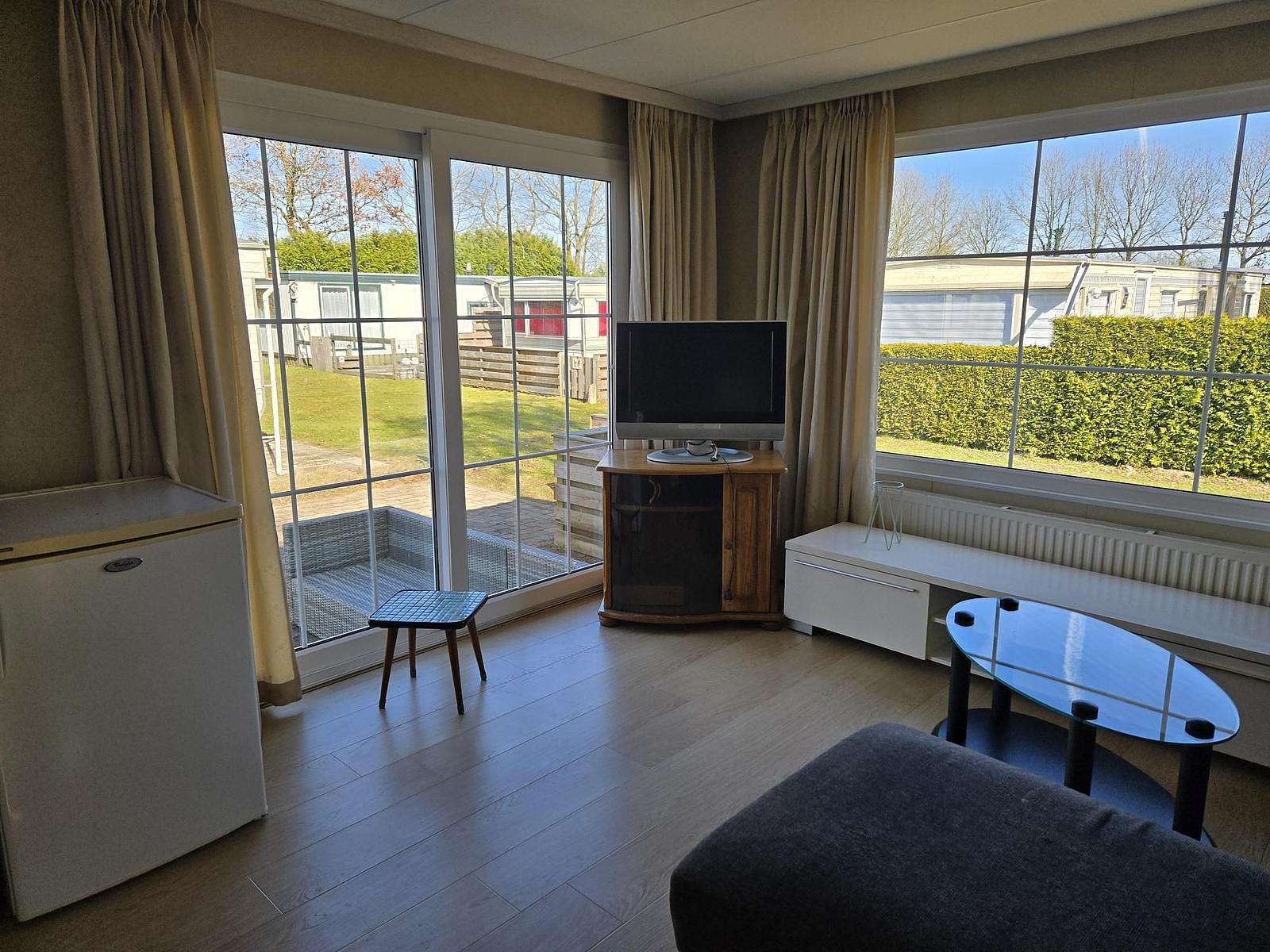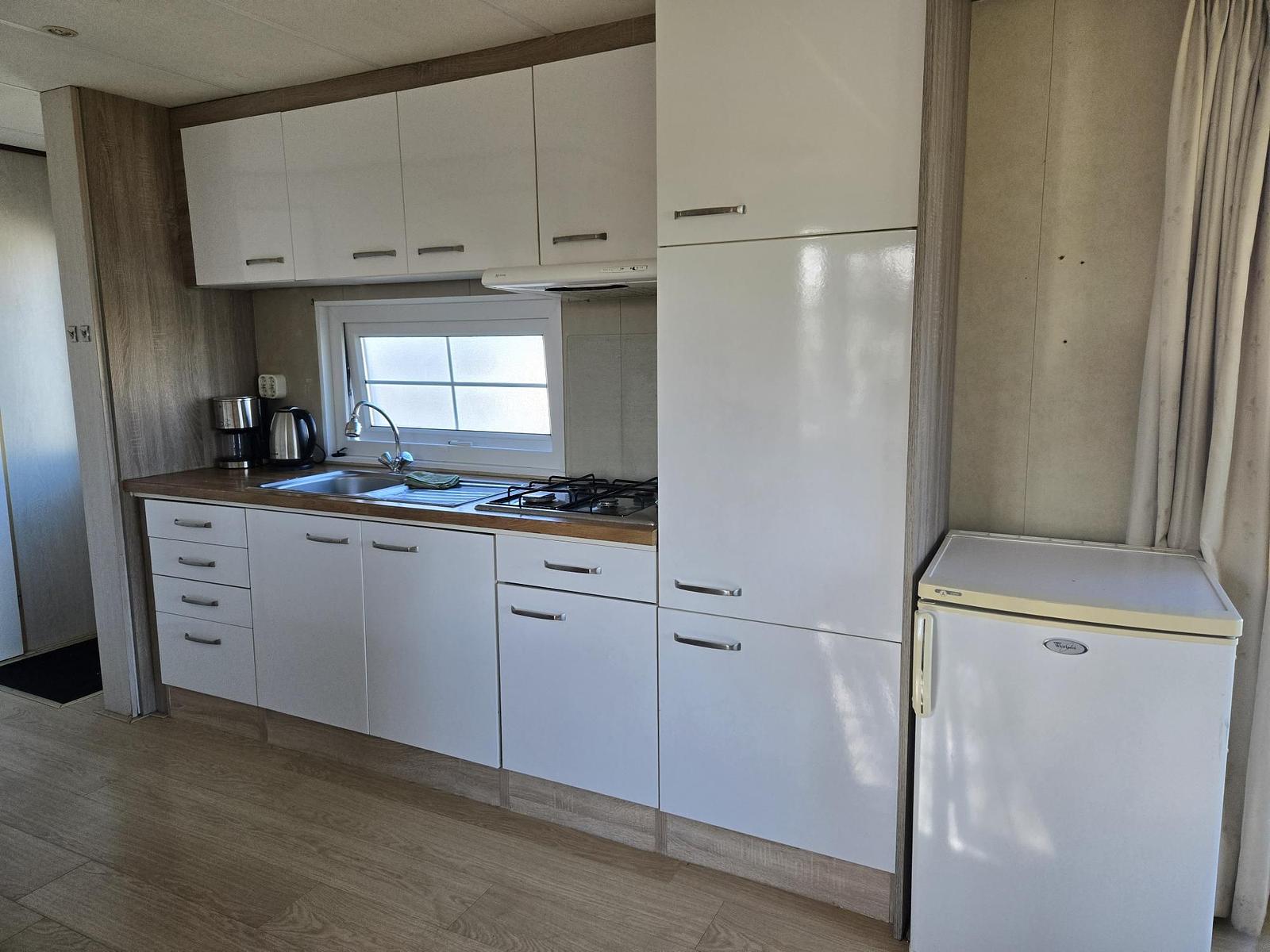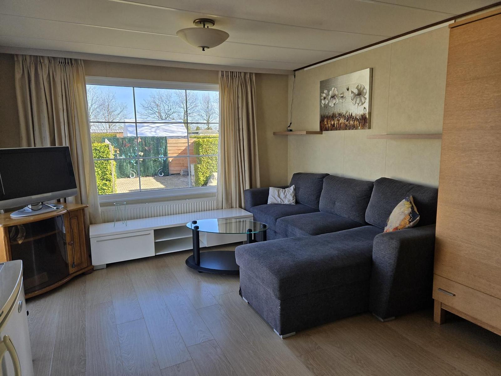 Entree. Woonkamer met openslaande deuren naar het terras. Keuken (4-pits kookplaat, afzuigkap, rvs spoelbak en koelkast). Slaapkamer met tweepersoonsbed en diverse vaste kasten. 2e slaapkamer met stapelbed en ruimte voor wasmachine, droger of koelkast. Badkamer met douchecabine, wastafel, toilet en afzuiging. Cv-installatie (2010) aanwezig. Tuinhuisje 3.00 x 2.00m. Bouwjaar: 2004. Vloeren v.z.v. kunststof laminaat. Duafort schroten aan de buitenzijde met kunststof kozijnen v.z.v. dubbelglas. In dit chalet mag gerecreëerd worden van 1 april t/m 15 oktober.