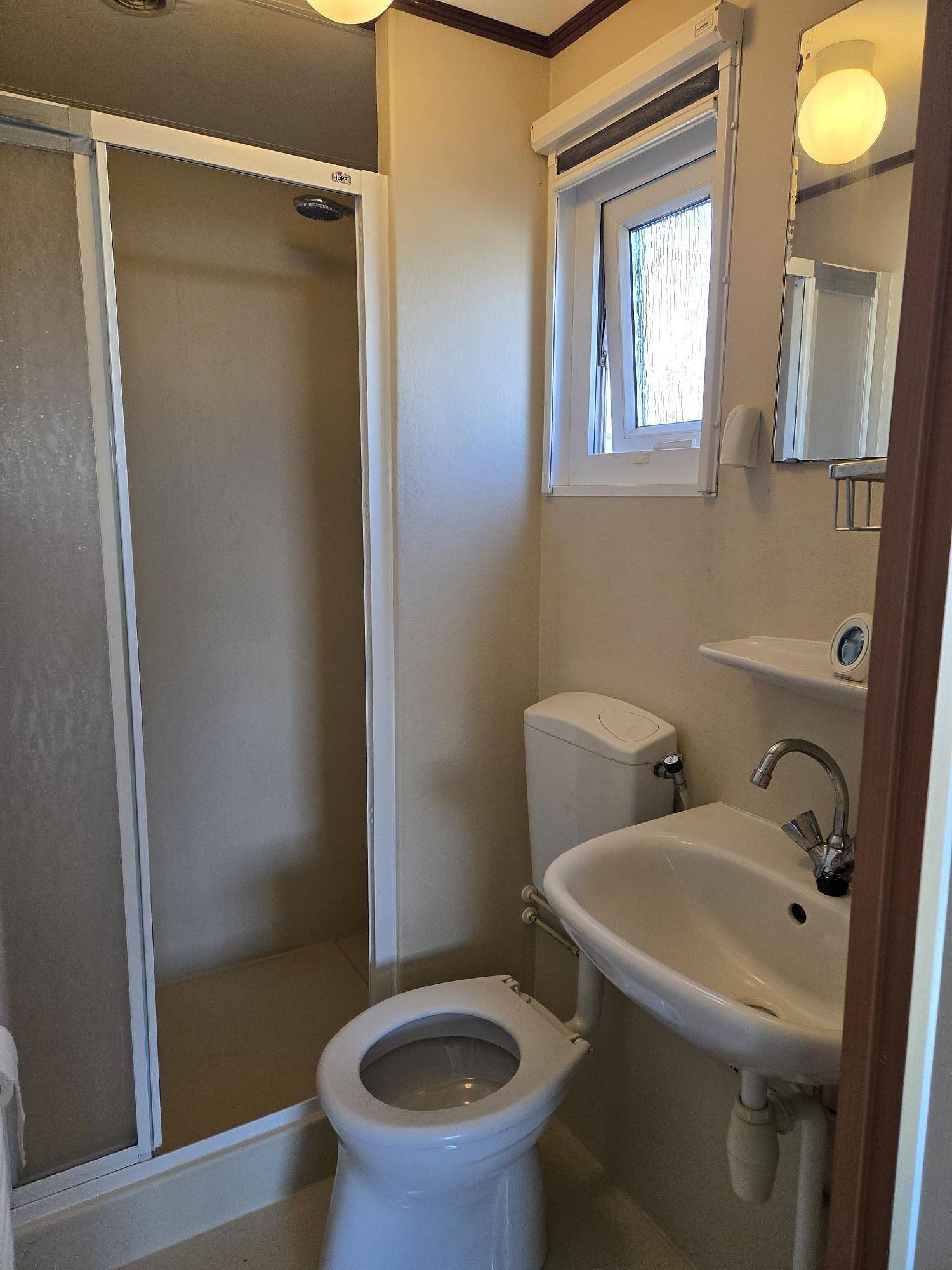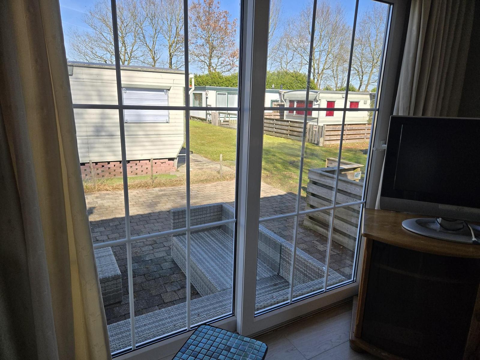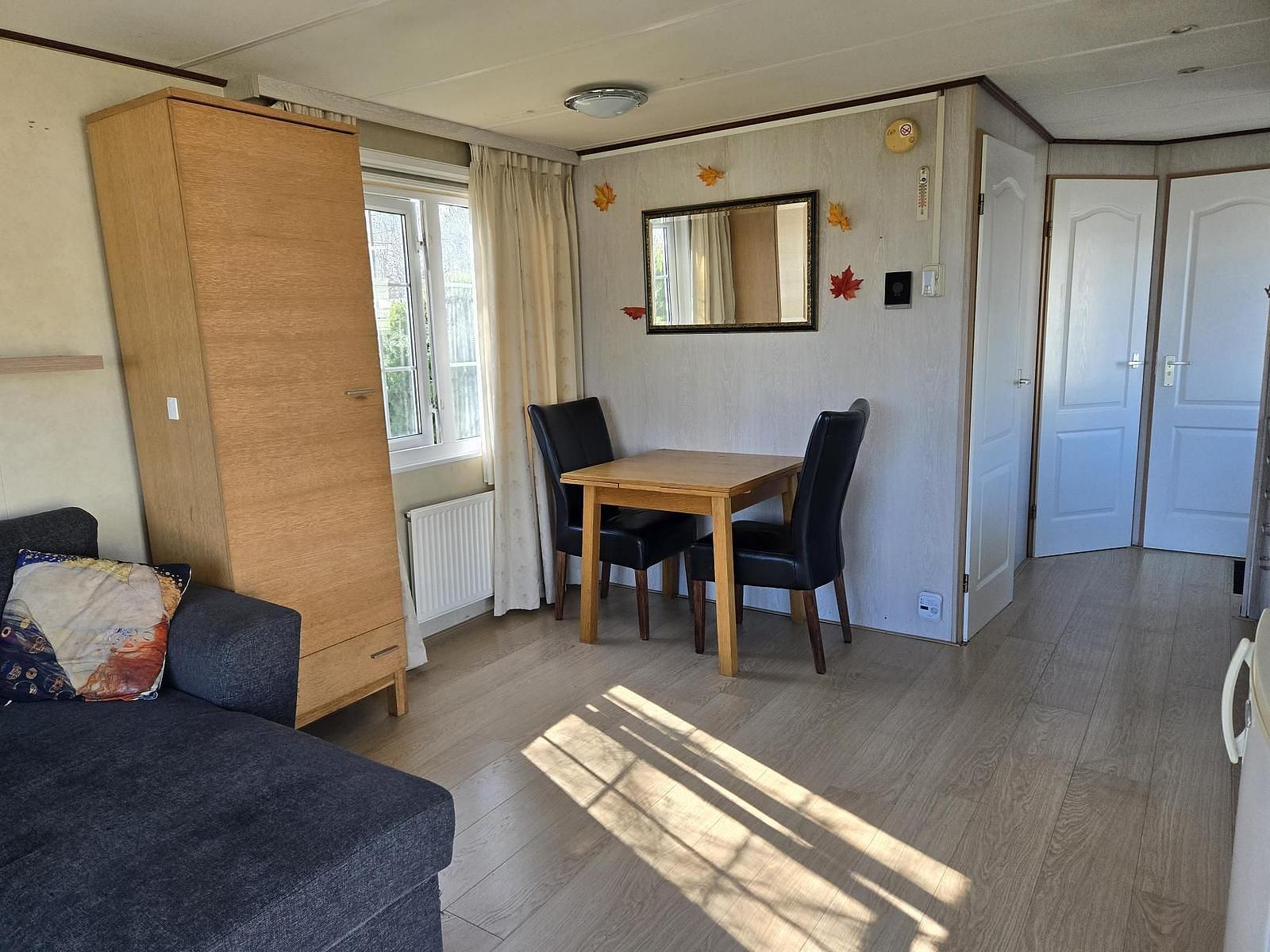 Entree. Woonkamer met openslaande deuren naar het terras. Keuken (4-pits kookplaat, afzuigkap, rvs spoelbak en koelkast). Slaapkamer met tweepersoonsbed en diverse vaste kasten. 2e slaapkamer met stapelbed en ruimte voor wasmachine, droger of koelkast. Badkamer met douchecabine, wastafel, toilet en afzuiging. Cv-installatie (2010) aanwezig. Tuinhuisje 3.00 x 2.00m. Bouwjaar: 2004. Vloeren v.z.v. kunststof laminaat. Duafort schroten aan de buitenzijde met kunststof kozijnen v.z.v. dubbelglas. In dit chalet mag gerecreëerd worden van 1 april t/m 15 oktober.