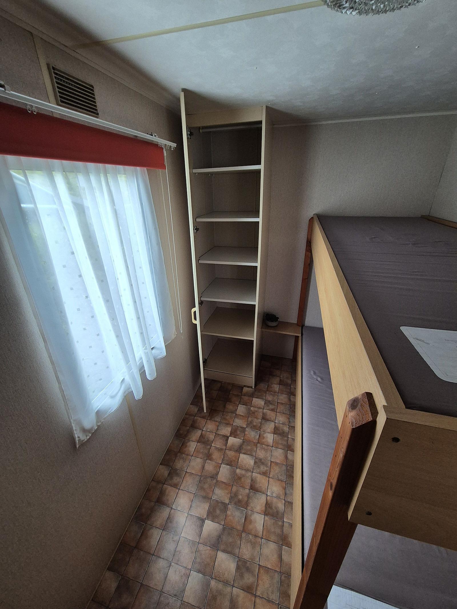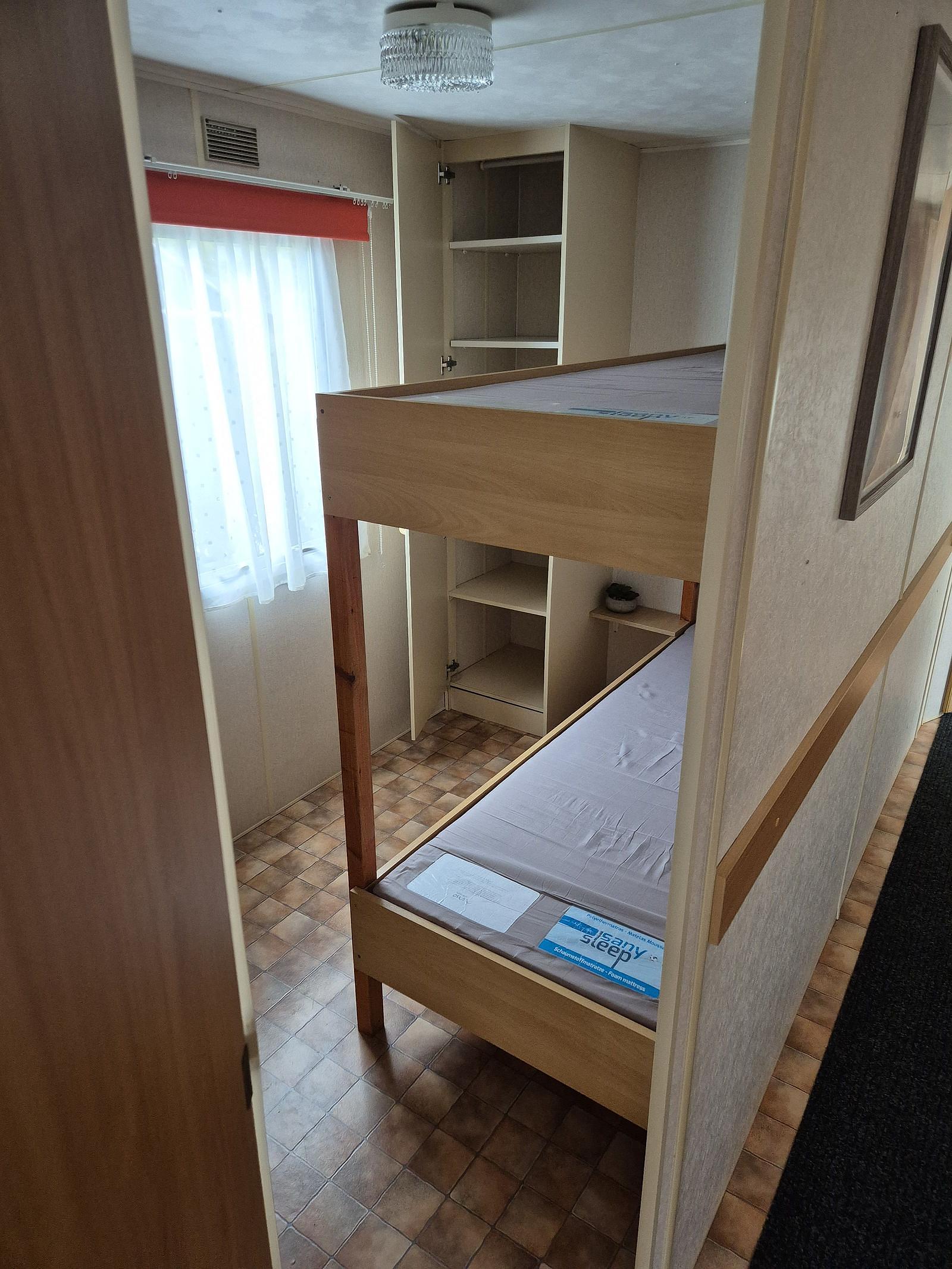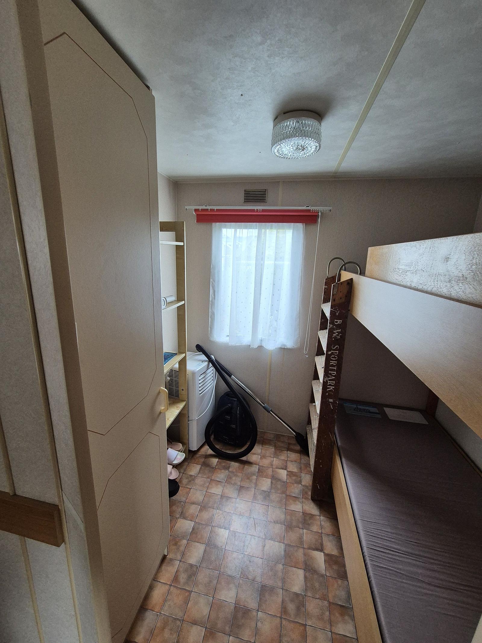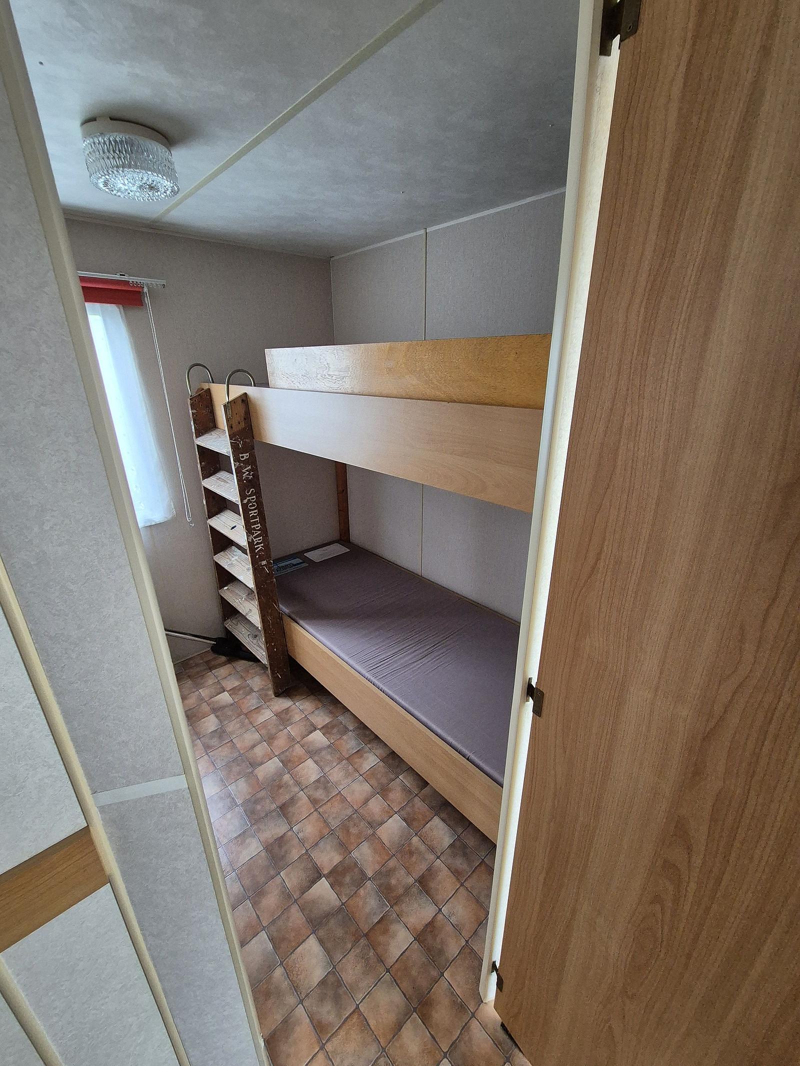Indeling: Entree. Woonkamer met erker en een tuindeur naar het terras. Keuken met kookplaat, afzuigkap, spoelbak, koel-vries combinatie. Gaskachel aanwezig. Slaapkamer met tweepersoonsbed en vaste kastenwand. 2 slaapkamers met een stapelbed. Badkamer met douchecabine, toilet en badmeubel. Tuinhuisje met aansluiting voor wasmachine aanwezig. Gedeeltelijk omheind. Het hele chalet is voorzien van een vinylvloer. Veel ramen zijn voorzien van duorollers. Merk: Atlas