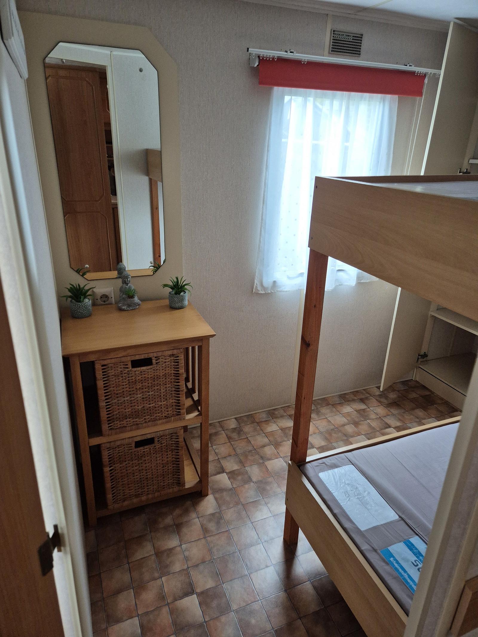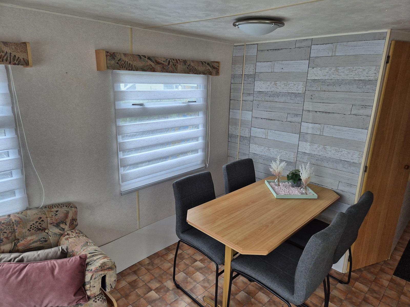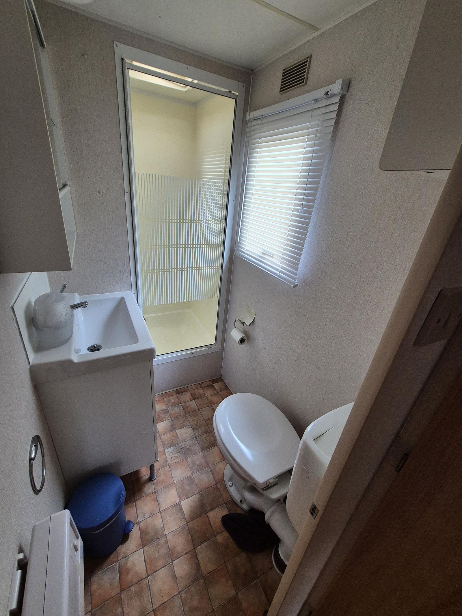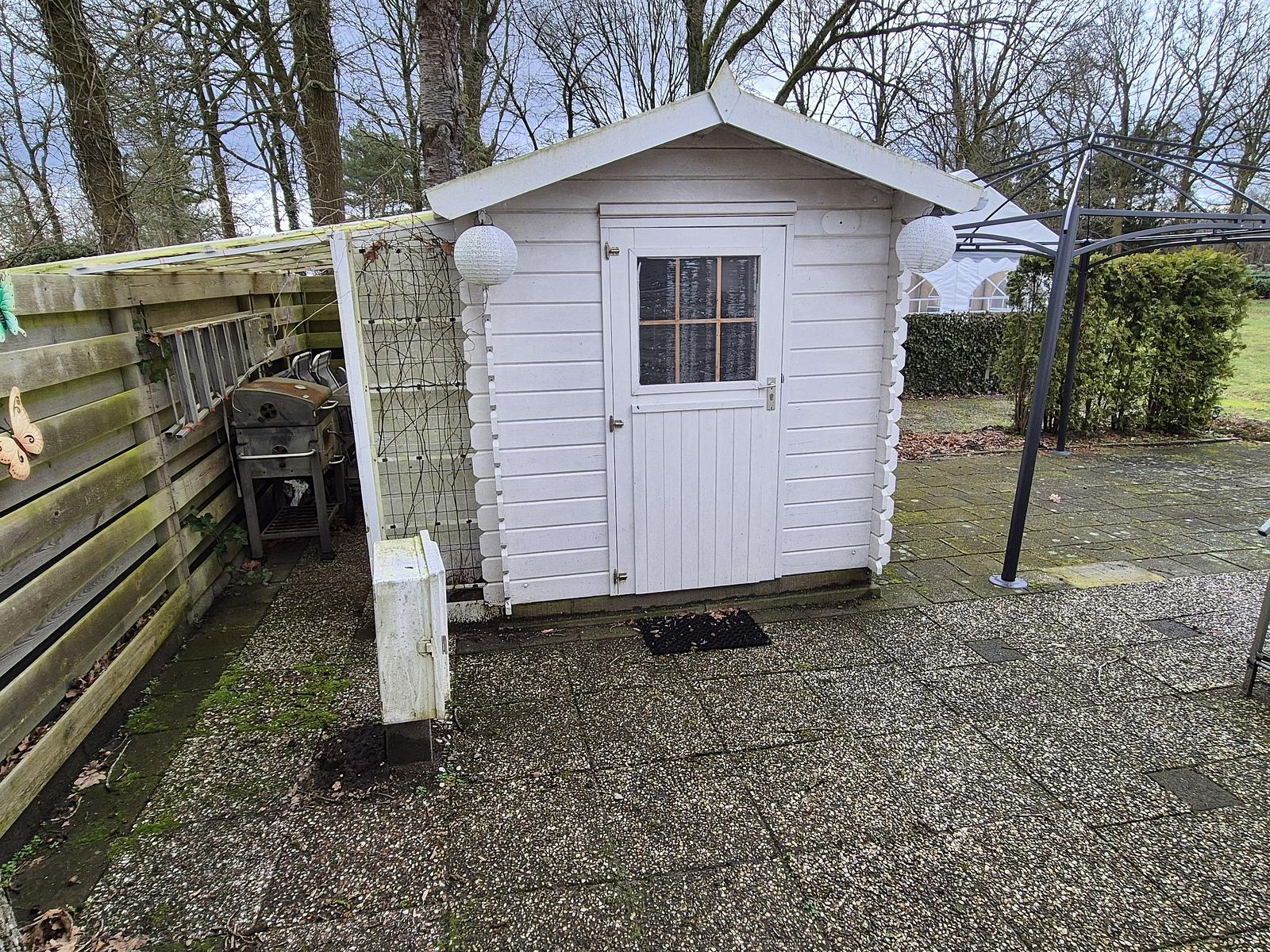 Indeling: Entree. Woonkamer met erker en een tuindeur naar het terras. Keuken met kookplaat, afzuigkap, spoelbak, koel-vries combinatie. Gaskachel aanwezig. Slaapkamer met tweepersoonsbed en vaste kastenwand. 2 slaapkamers met een stapelbed. Badkamer met douchecabine, toilet en badmeubel. Tuinhuisje met aansluiting voor wasmachine aanwezig. Gedeeltelijk omheind. Het hele chalet is voorzien van een vinylvloer. Veel ramen zijn voorzien van duorollers. Merk: Atlas