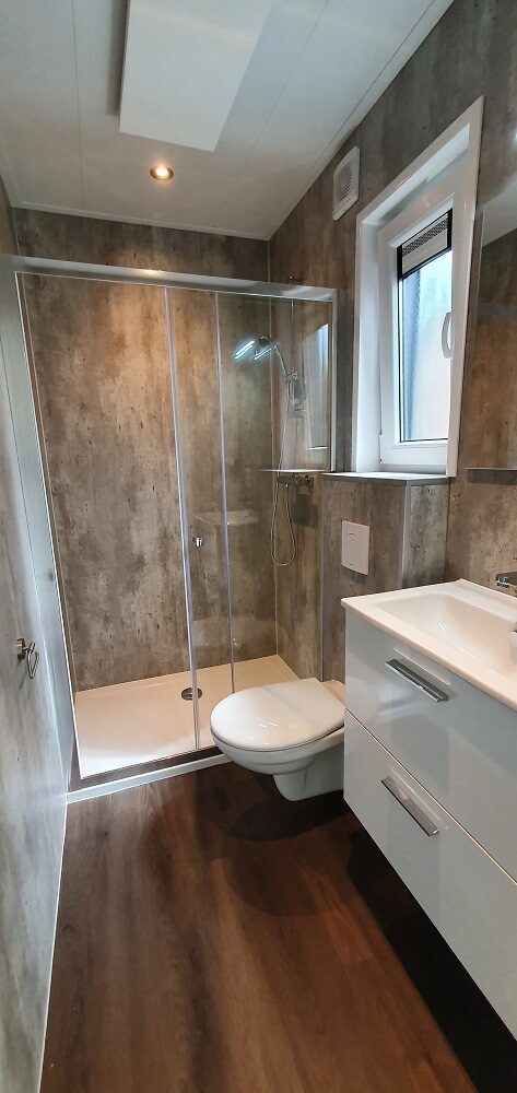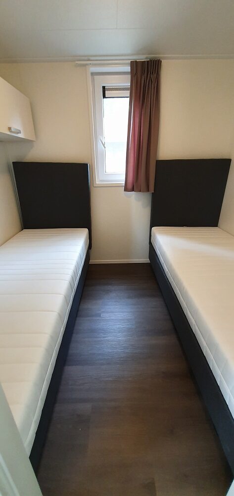 Het chalet heeft een oppervlakte van 12 meter bij 4 meter en beschikt over twee slaapkamers en een badkamer met douche en toilet.