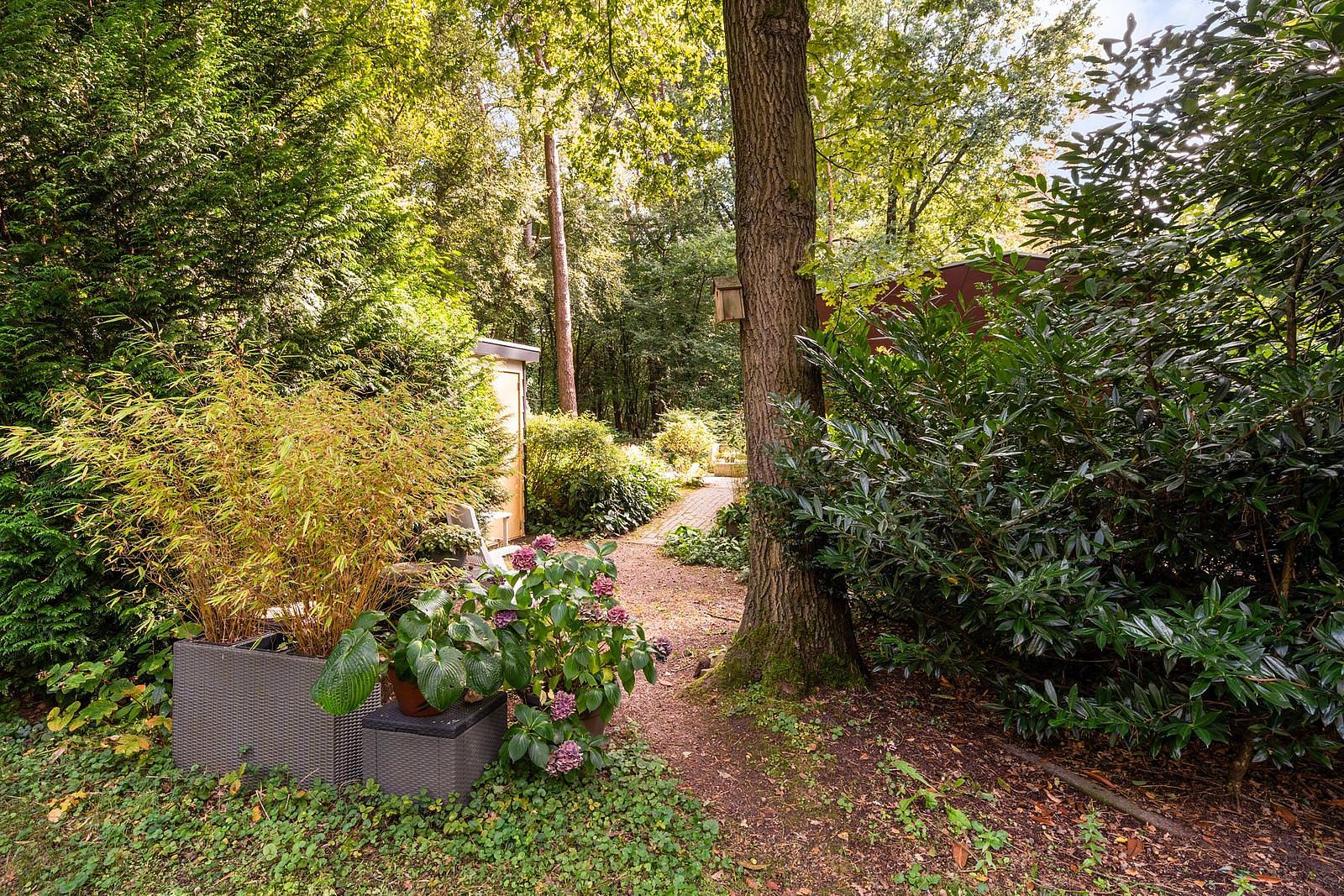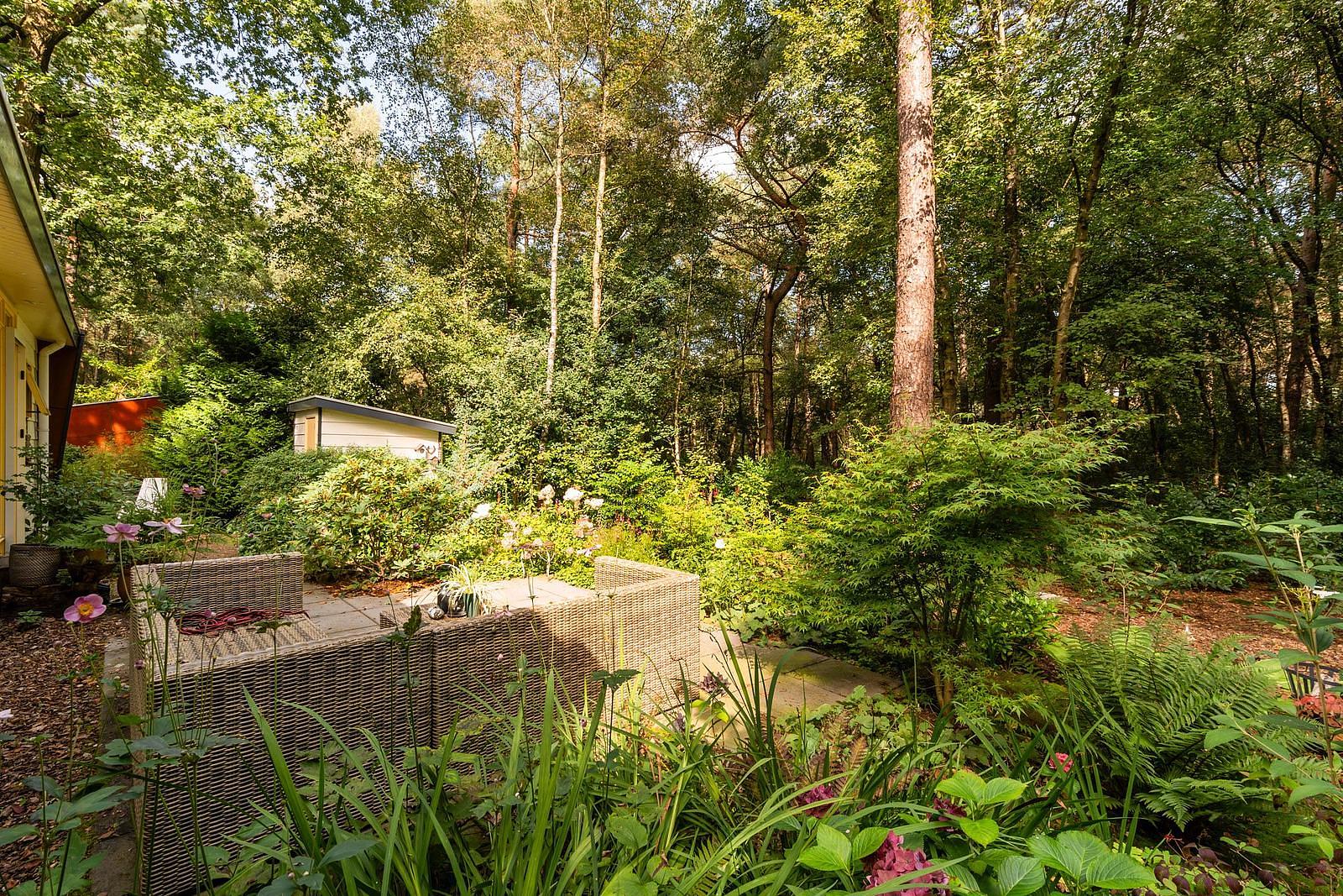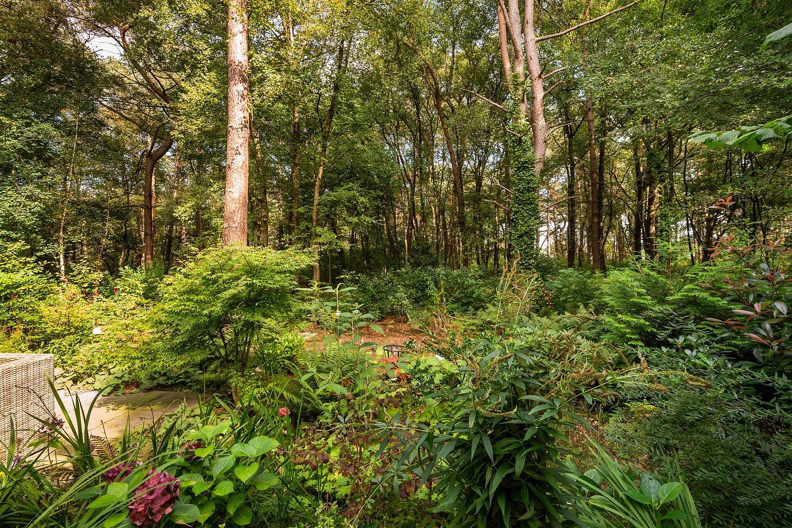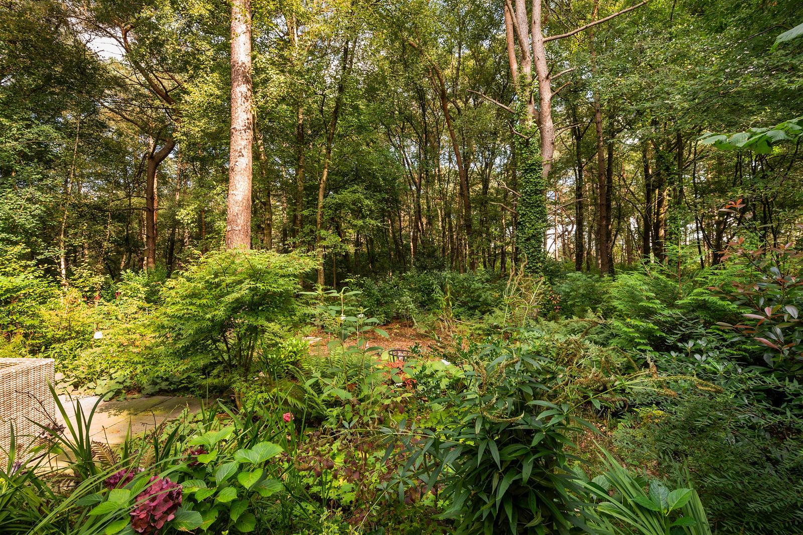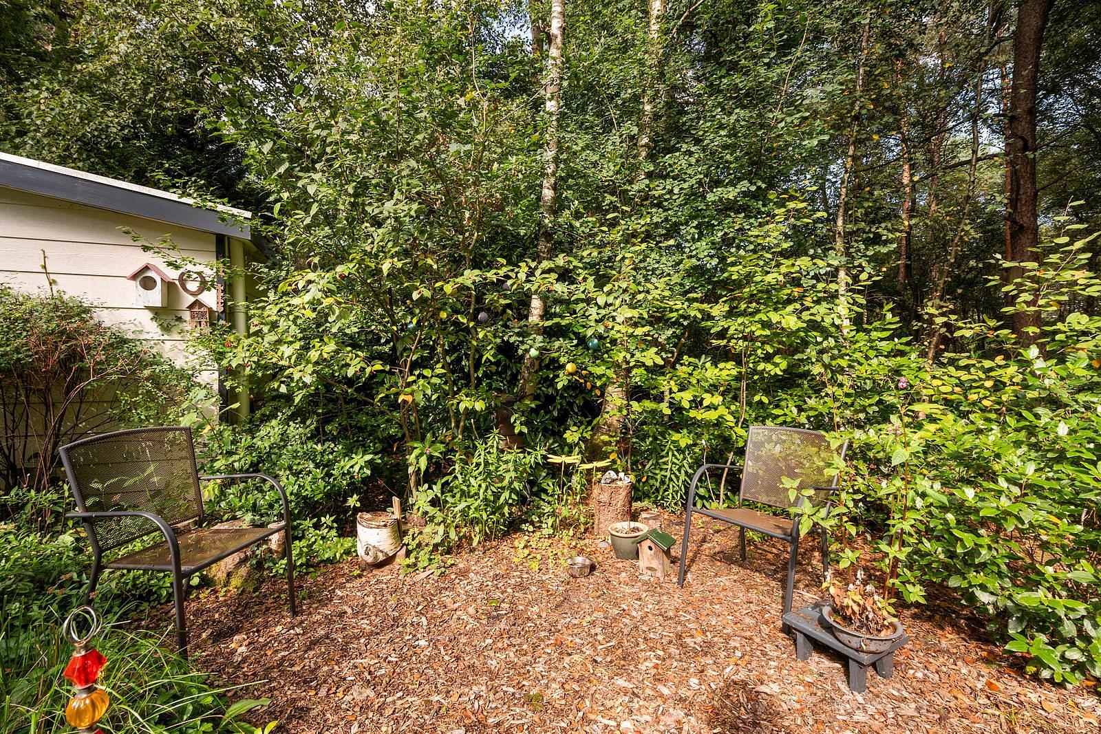 Via de schuifpui komt men in de tuin met verschillende terrassen. De ligging is uniek met veel groen en bos om de woning maar ook nog voldoen zon plekken. Zicht vanauit het chalet is fenomenaal te nomen, dit is recreëren pur sang.