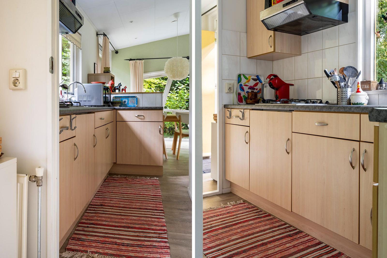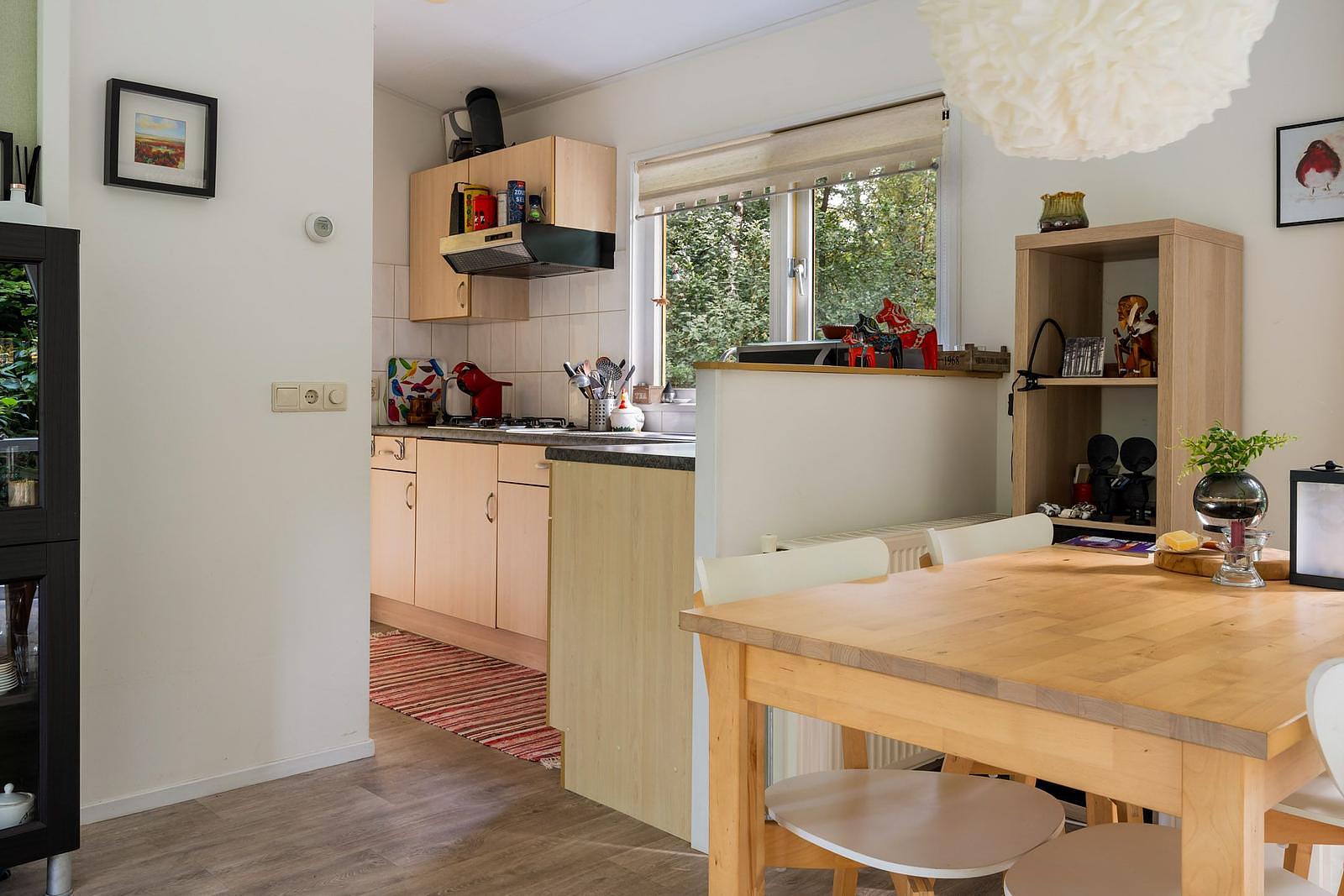 Hal, keuken met diverse apparatuur, gasfornuis, afzuigkap. Woonkamer met schuifpui naar het terras. Veel ramen daardoor veel licht in de woning.