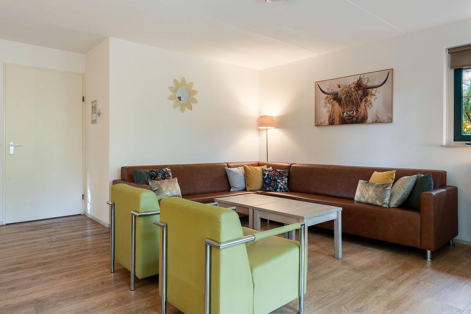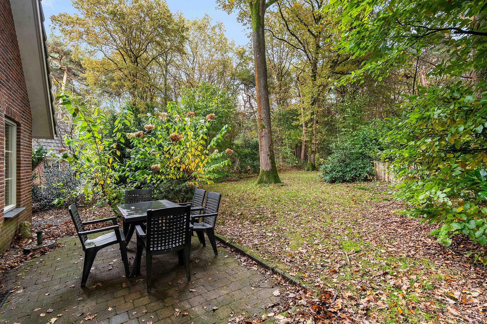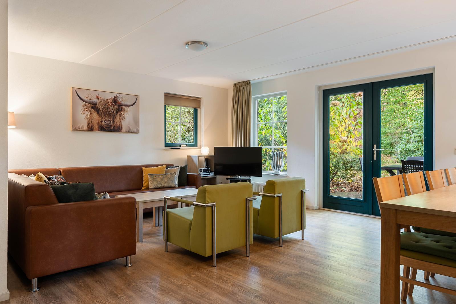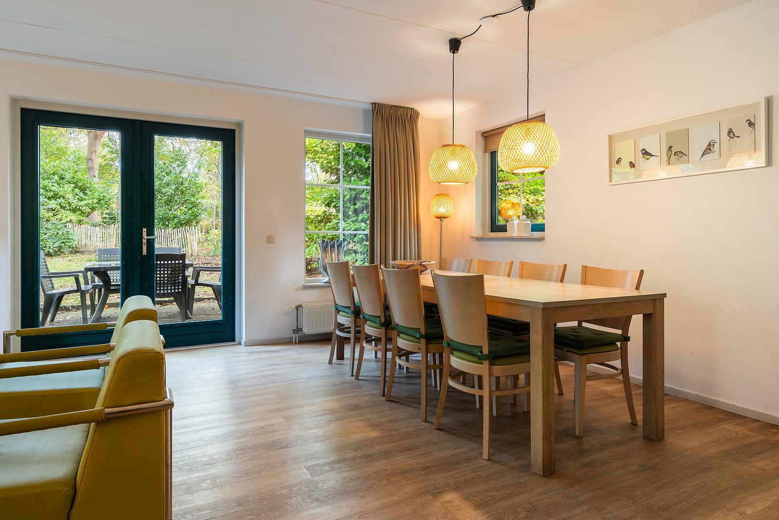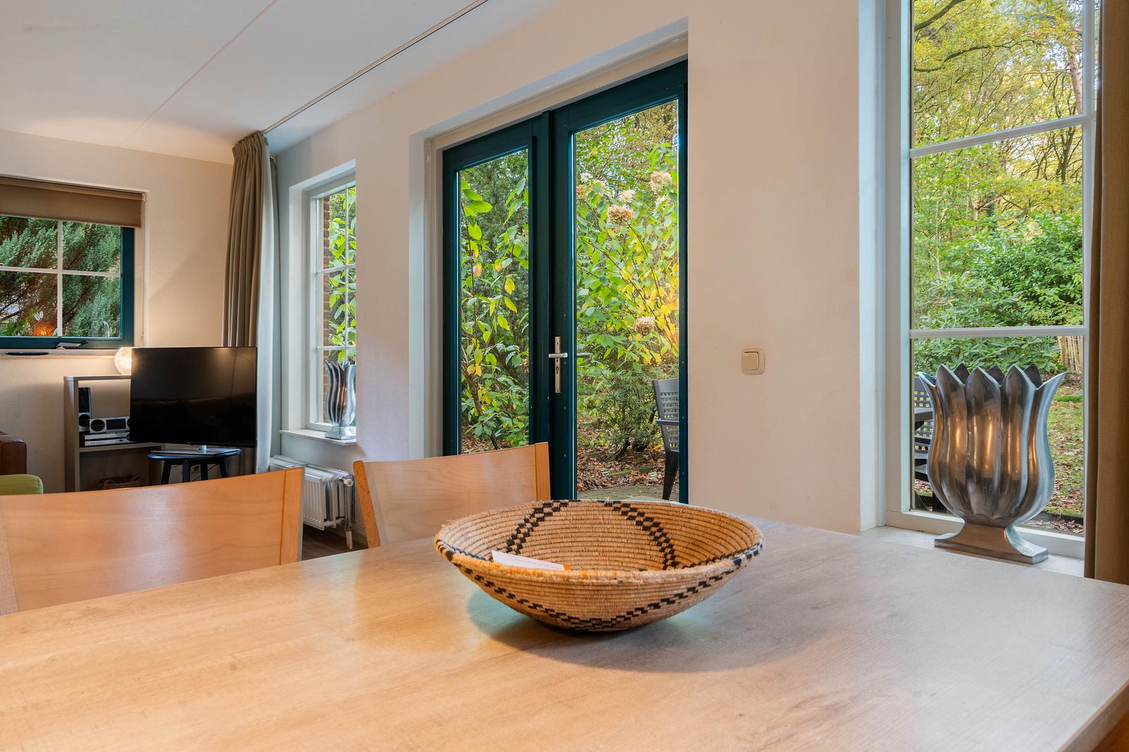 In de hal bevindt zich een apart toilet. De woonkamer biedt uitzicht op de royale bostuin die te bereiken is via de openslaande deuren.