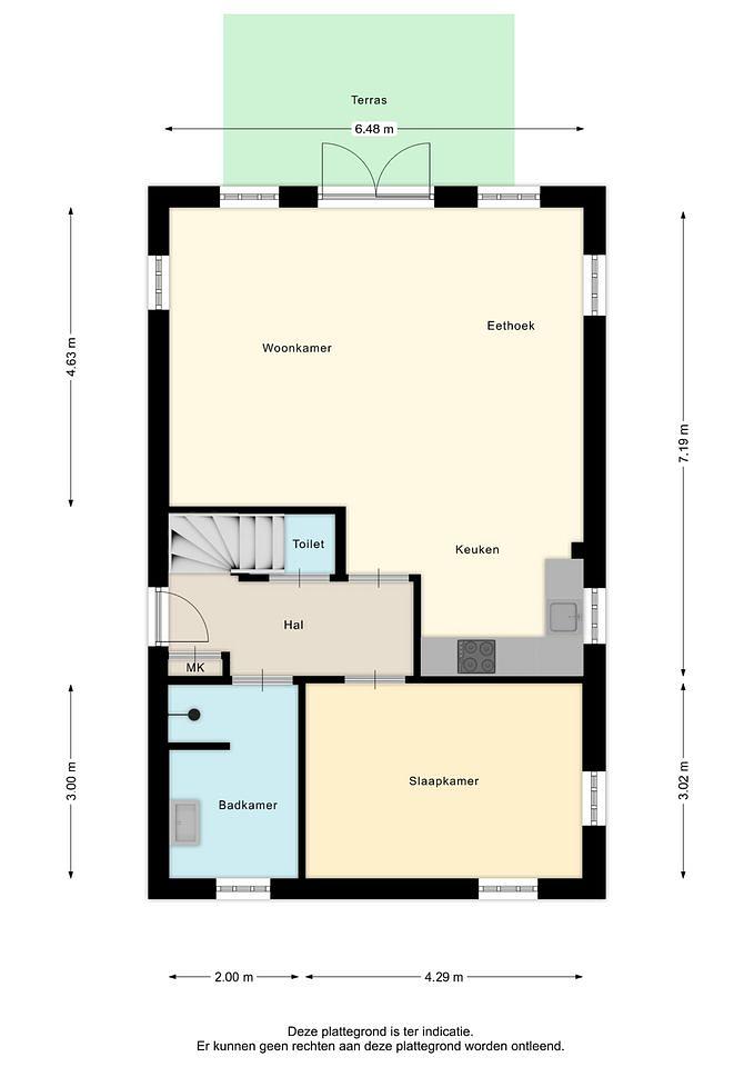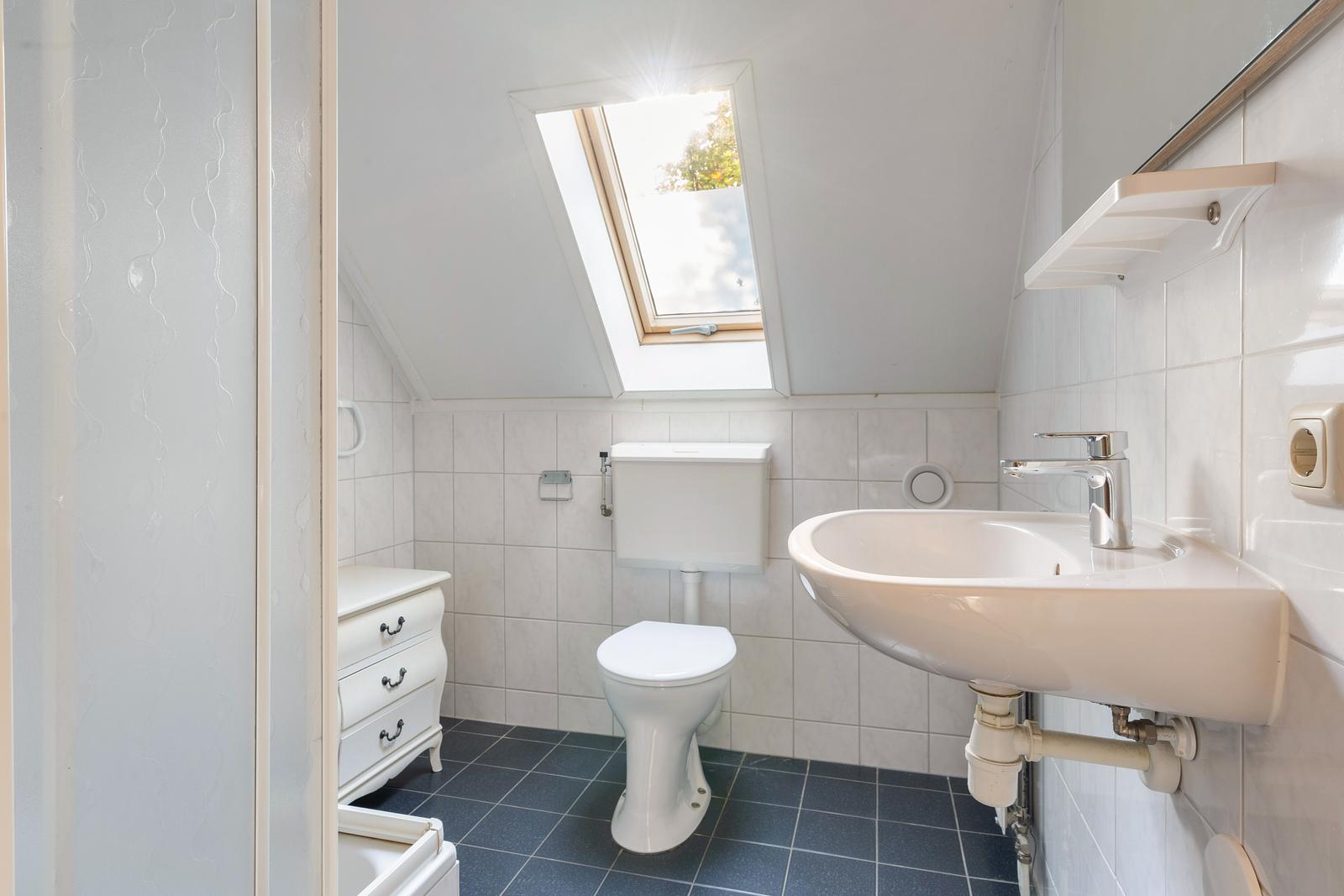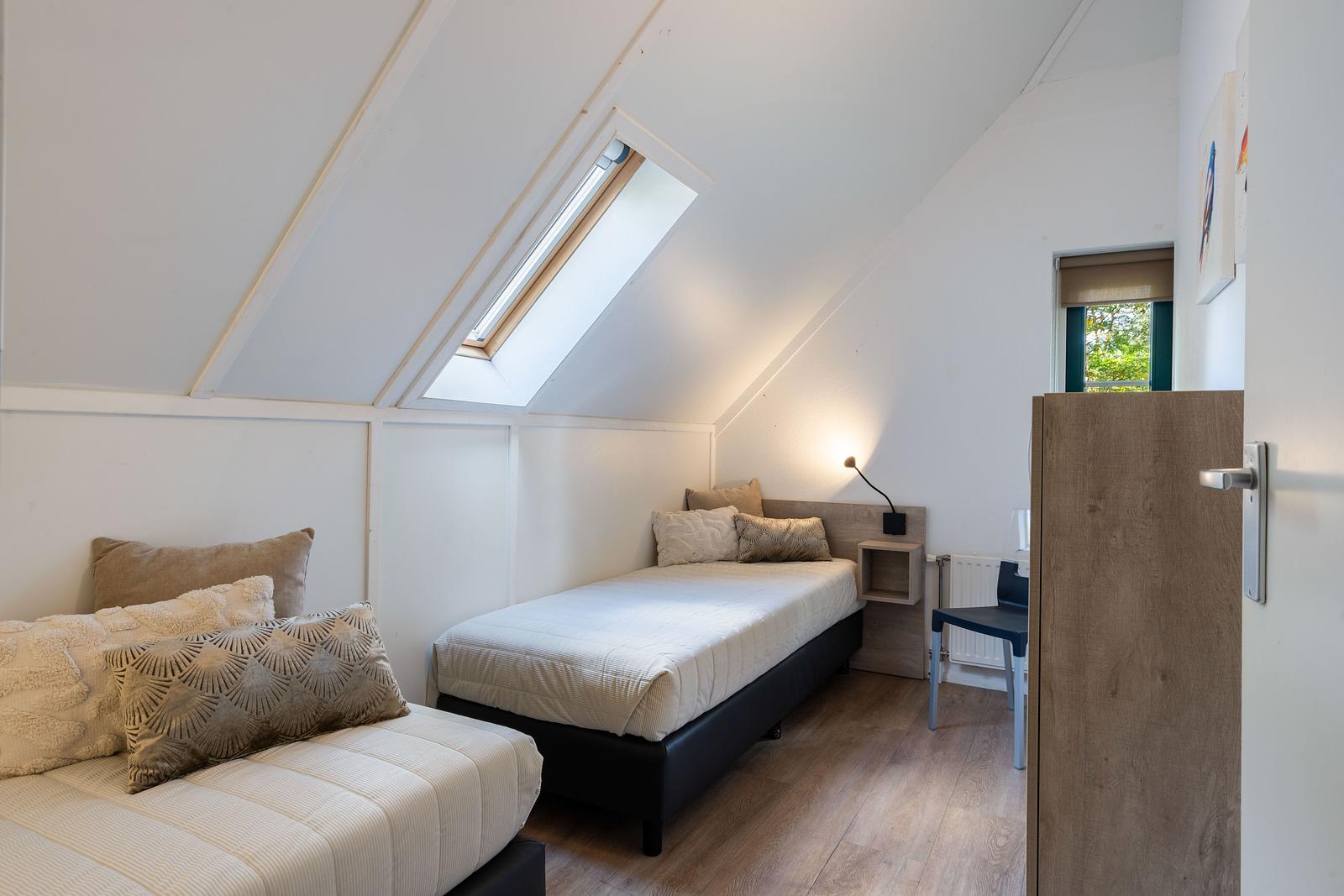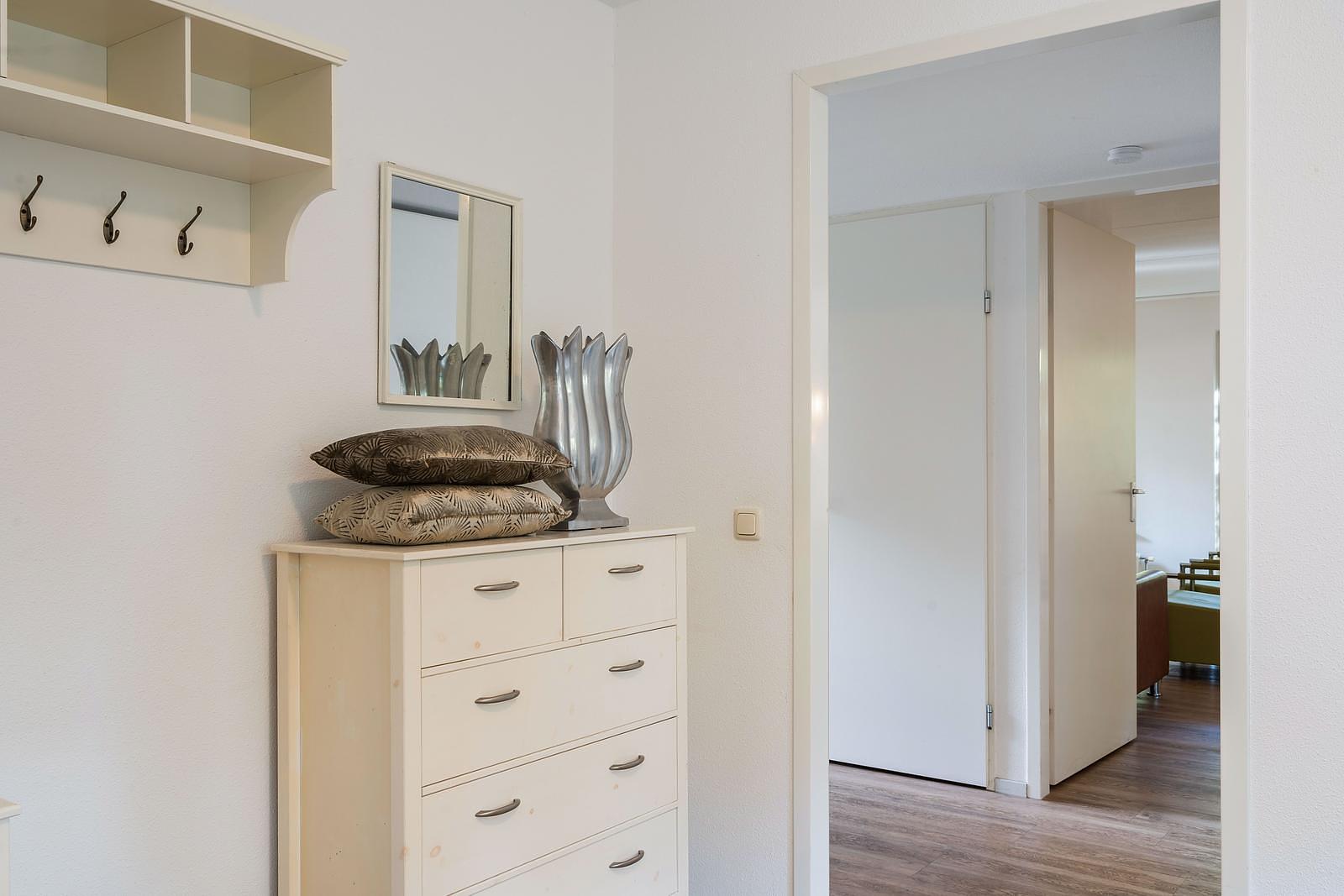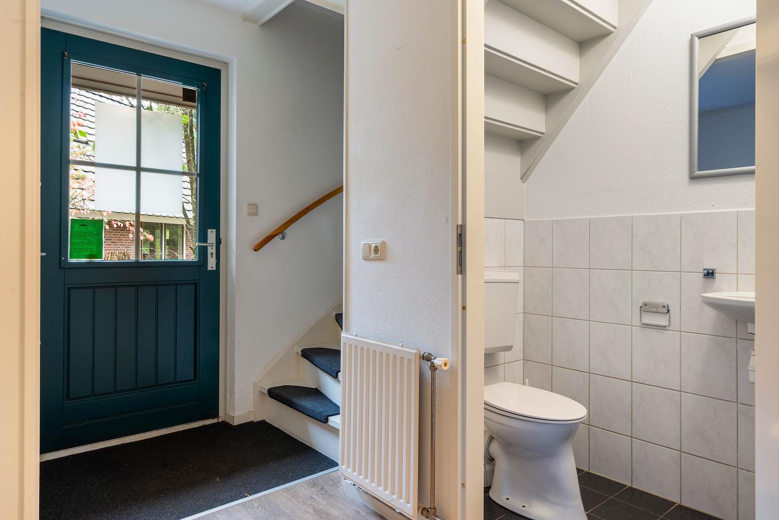 In de hal bevindt zich een apart toilet. De woonkamer biedt uitzicht op de royale bostuin die te bereiken is via de openslaande deuren.