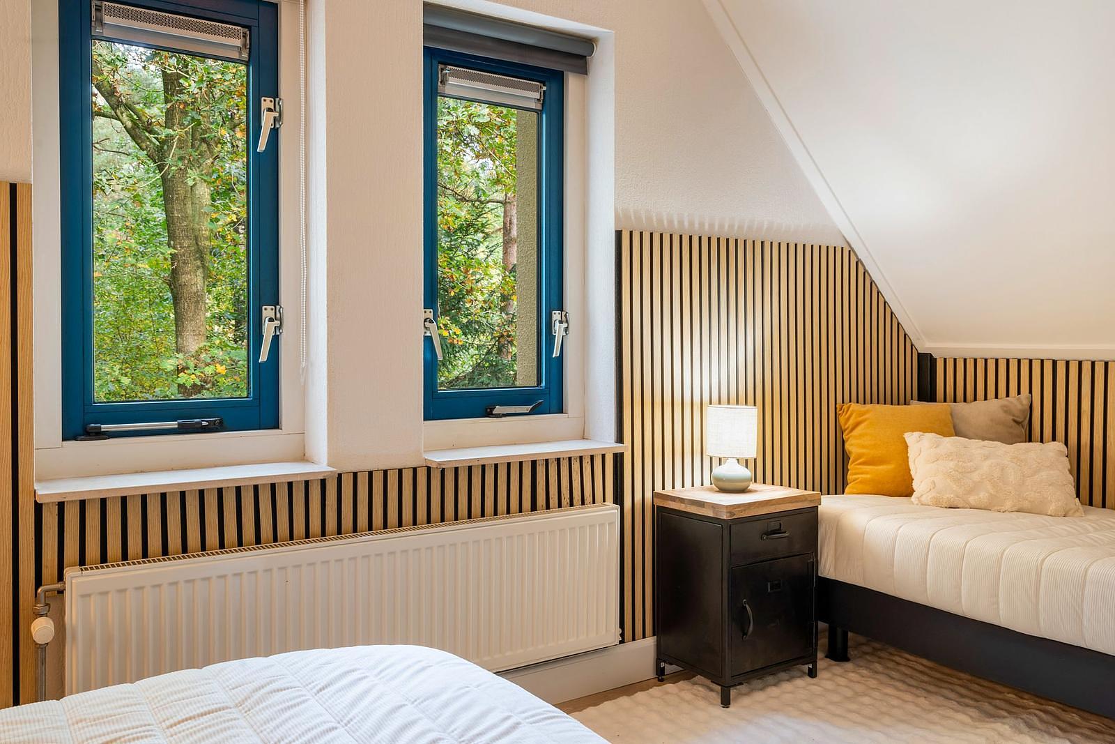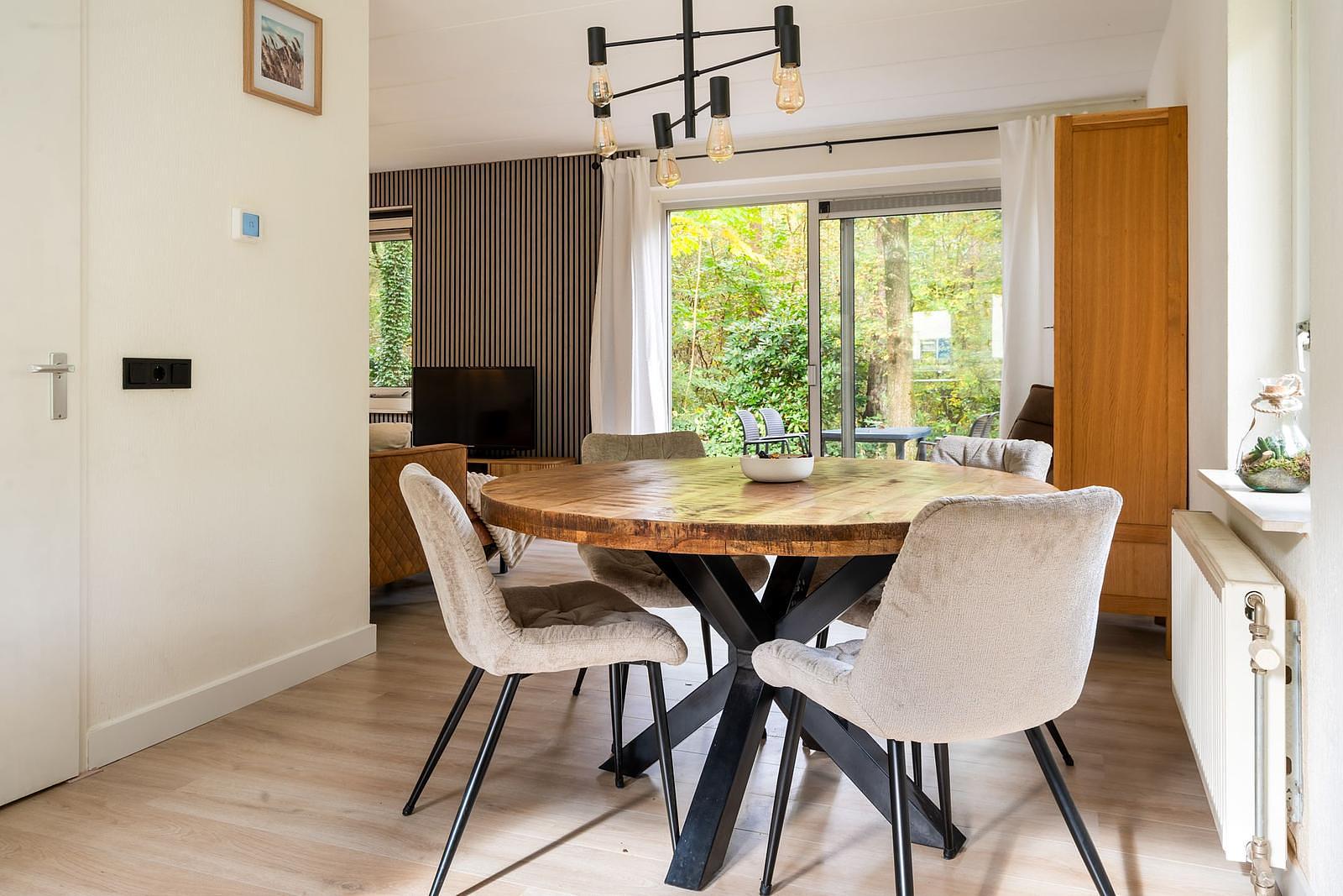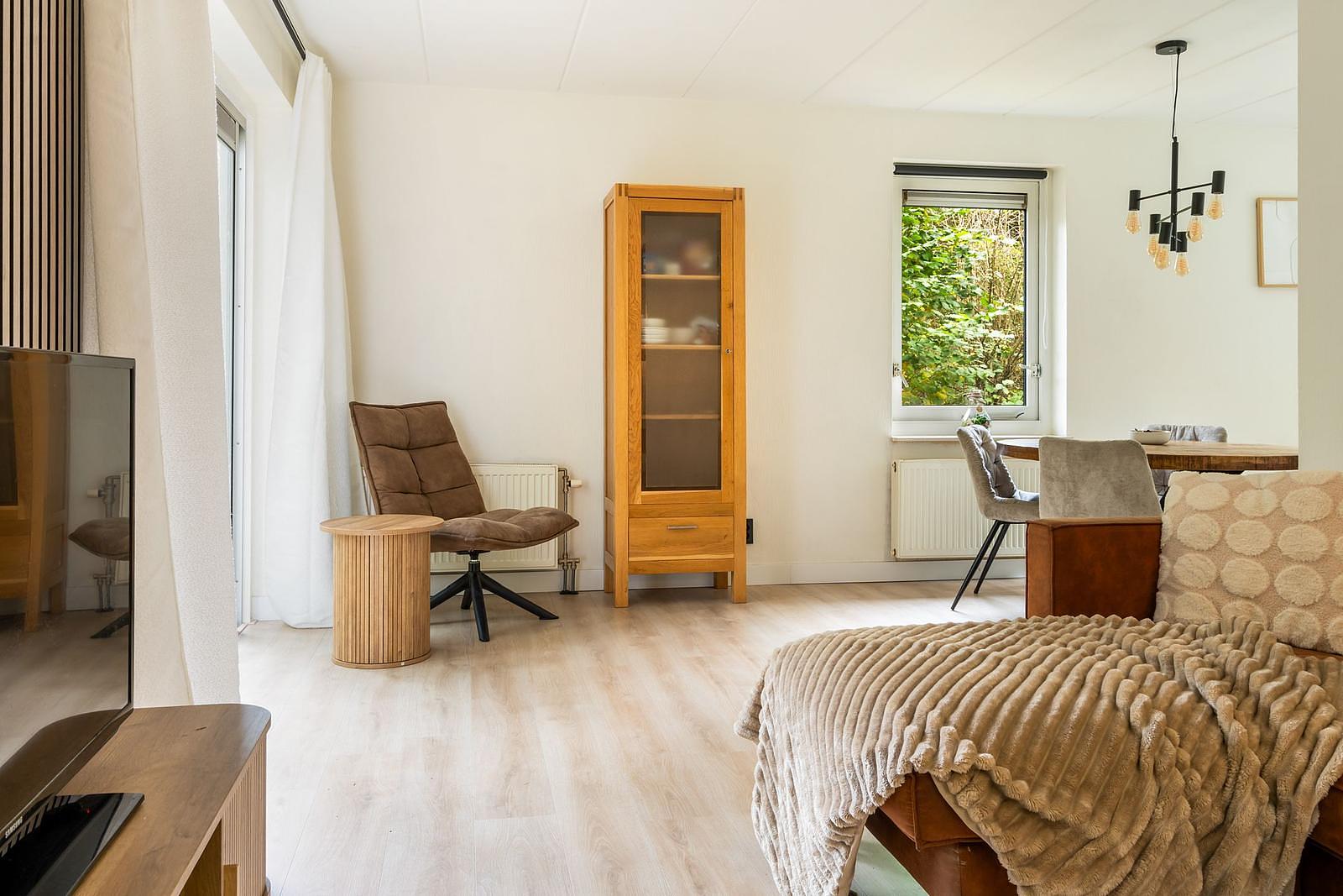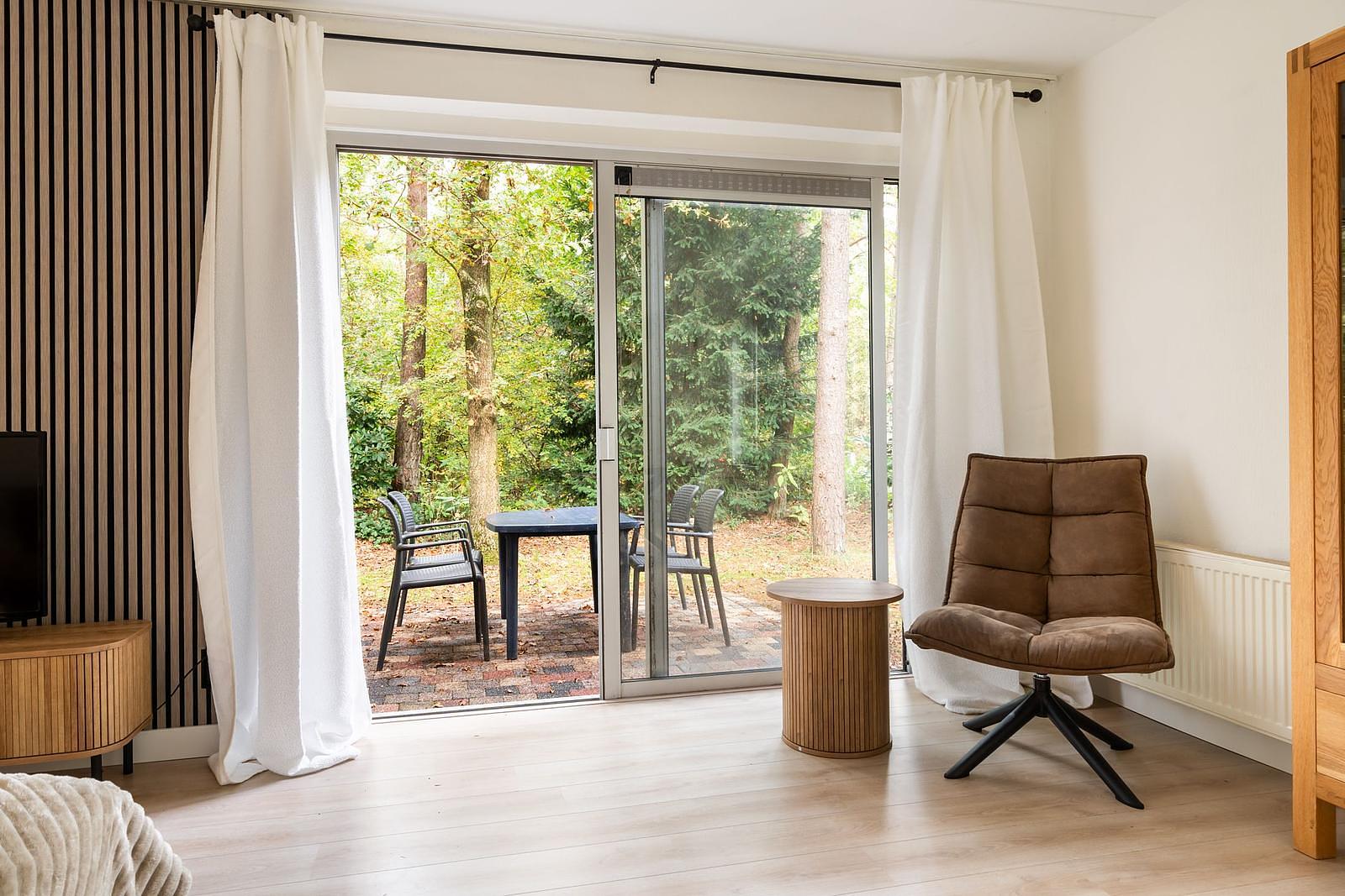 De woonkamer biedt uitzicht op de bosrijke tuin die te bereiken is via de schuifpui.Voorzien van luxe meubels, aan alles is gedacht.