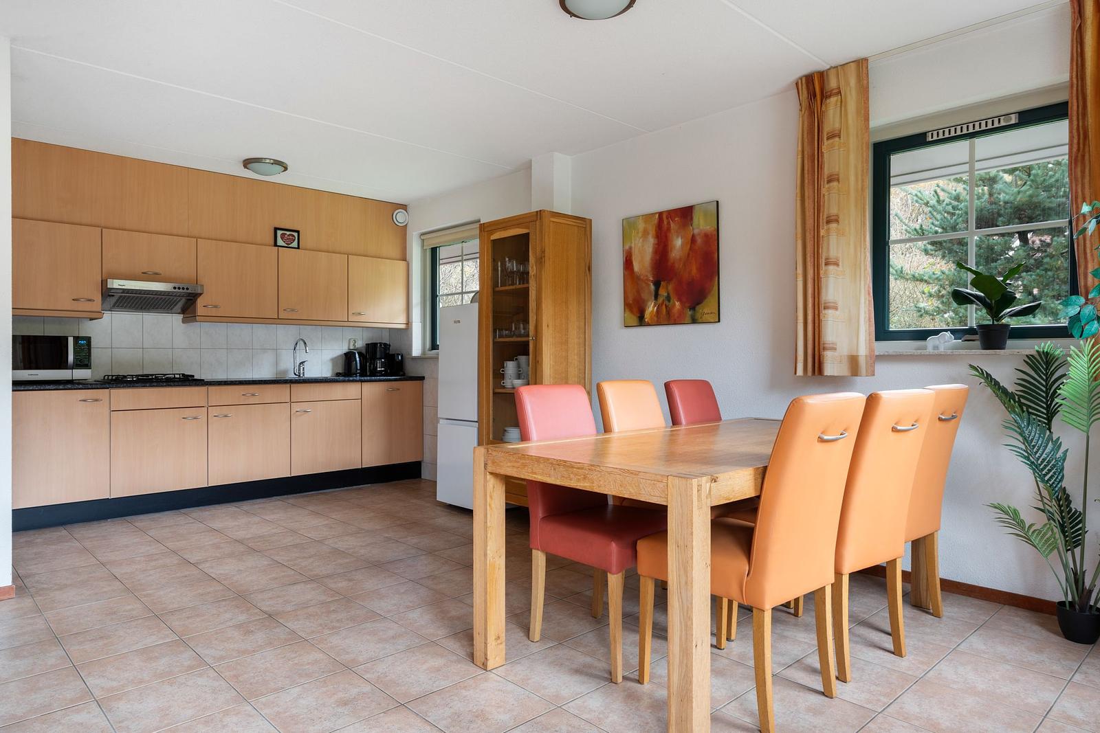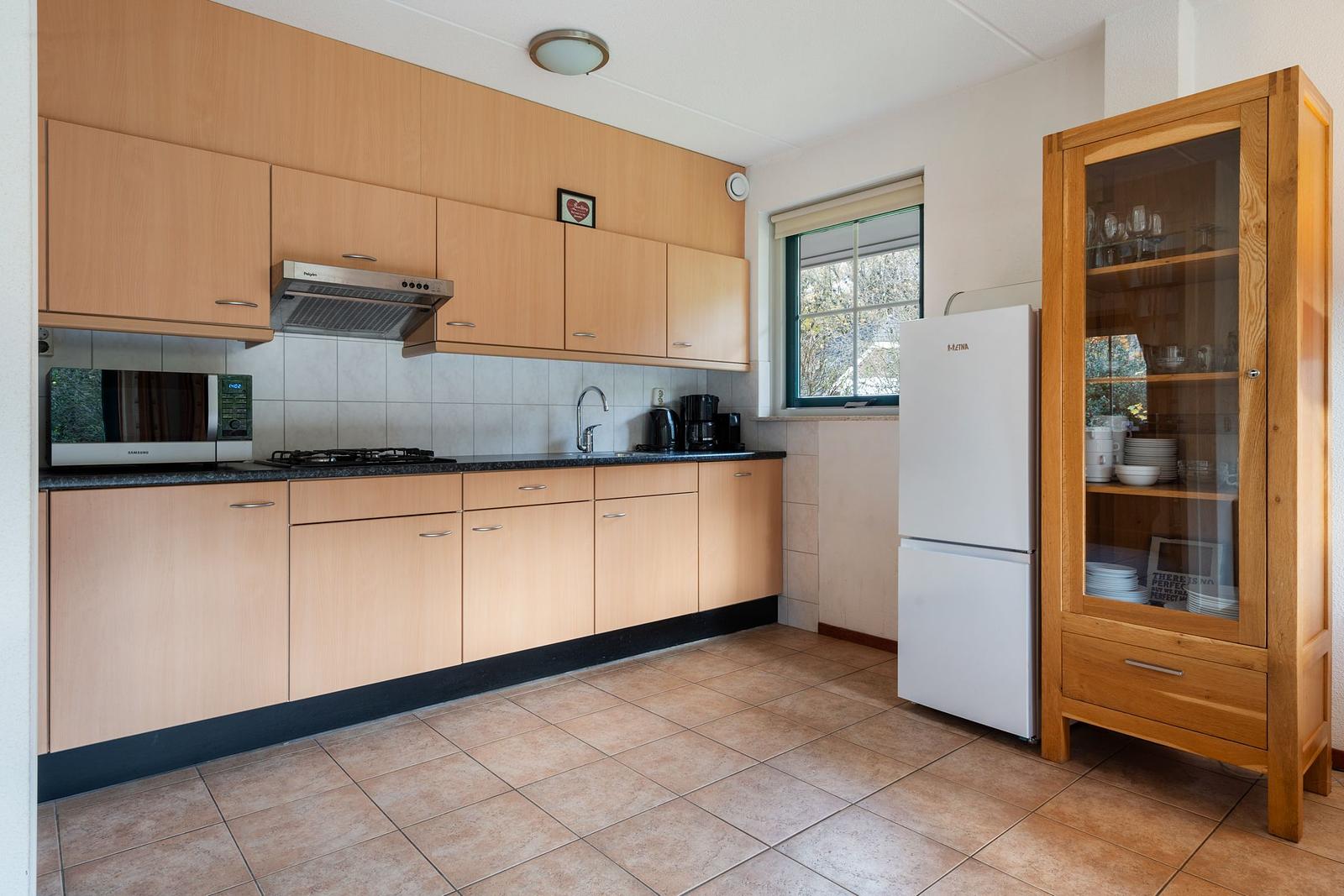 De keuken is van alle gemakken voorzien met een gasfornuis, afzuigkap, vaatwasser, combimagnetron en koelkast. Via de openslaande deuren stap je direct vanuit de woonkamer het terras op – perfect om te genieten van lange zomerse avonden.