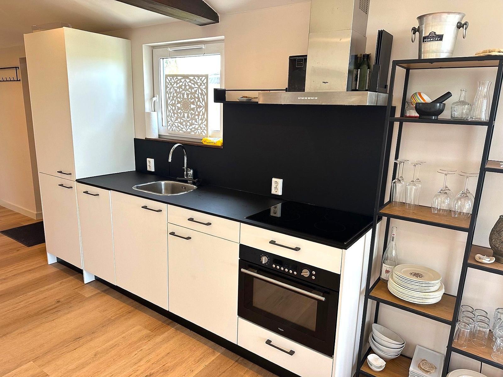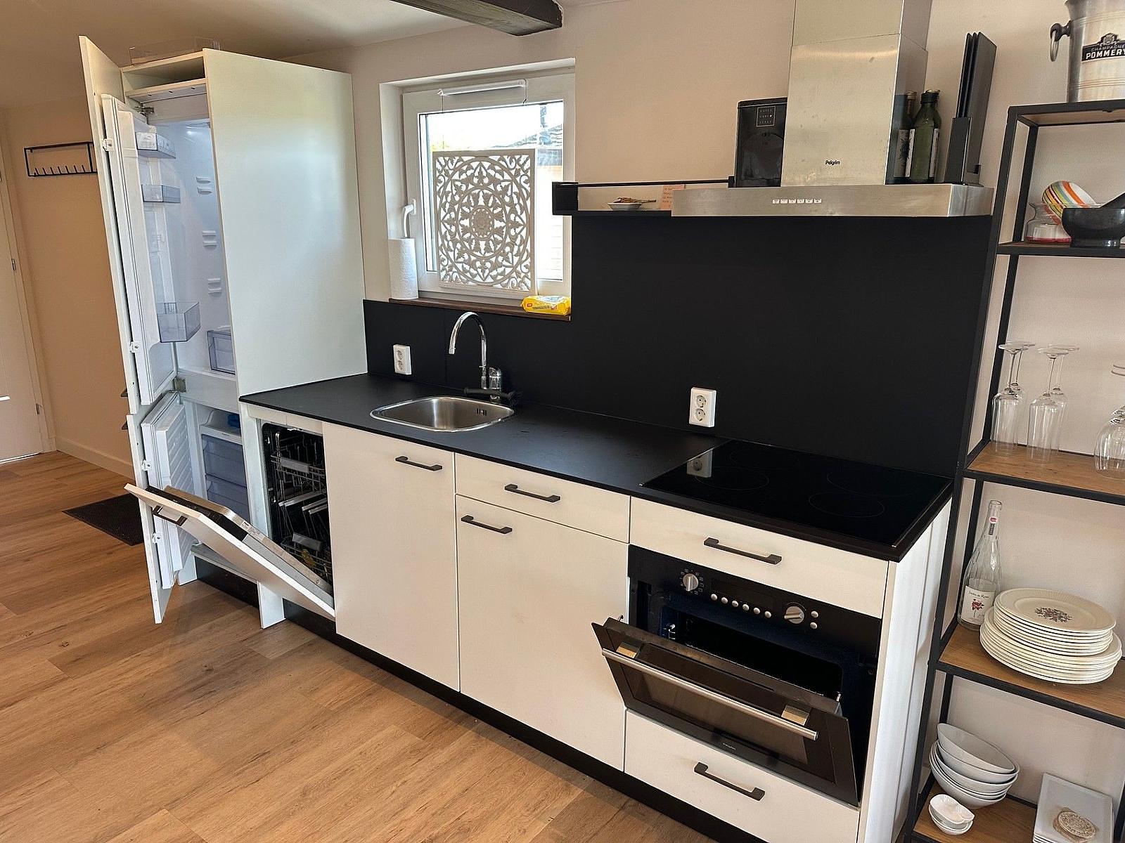 De moderne keuken is in het mat wit uitgevoerd en voorzien van een 4 pits inductie kookplaat met afzuigkap, oven, koelkast, vriezer, vaatwasser, afwasbak met kraan en veel opberg/kast-ruimte.