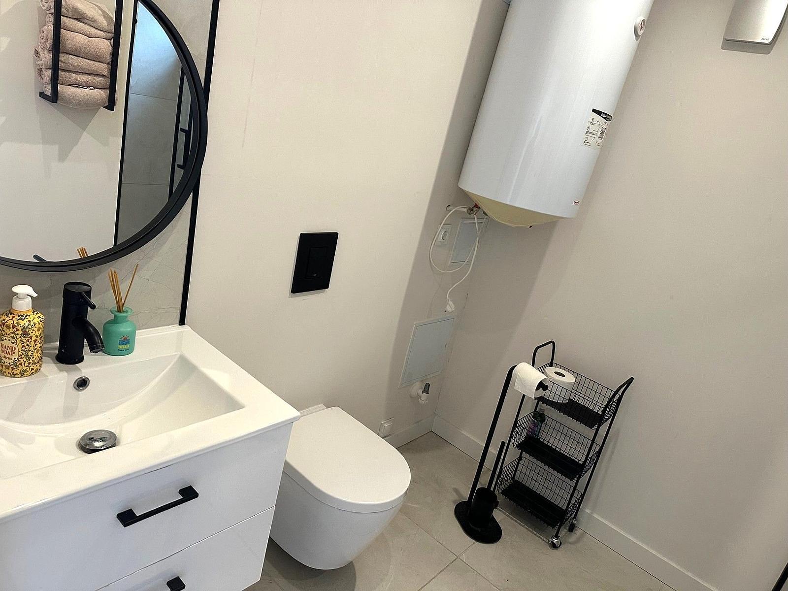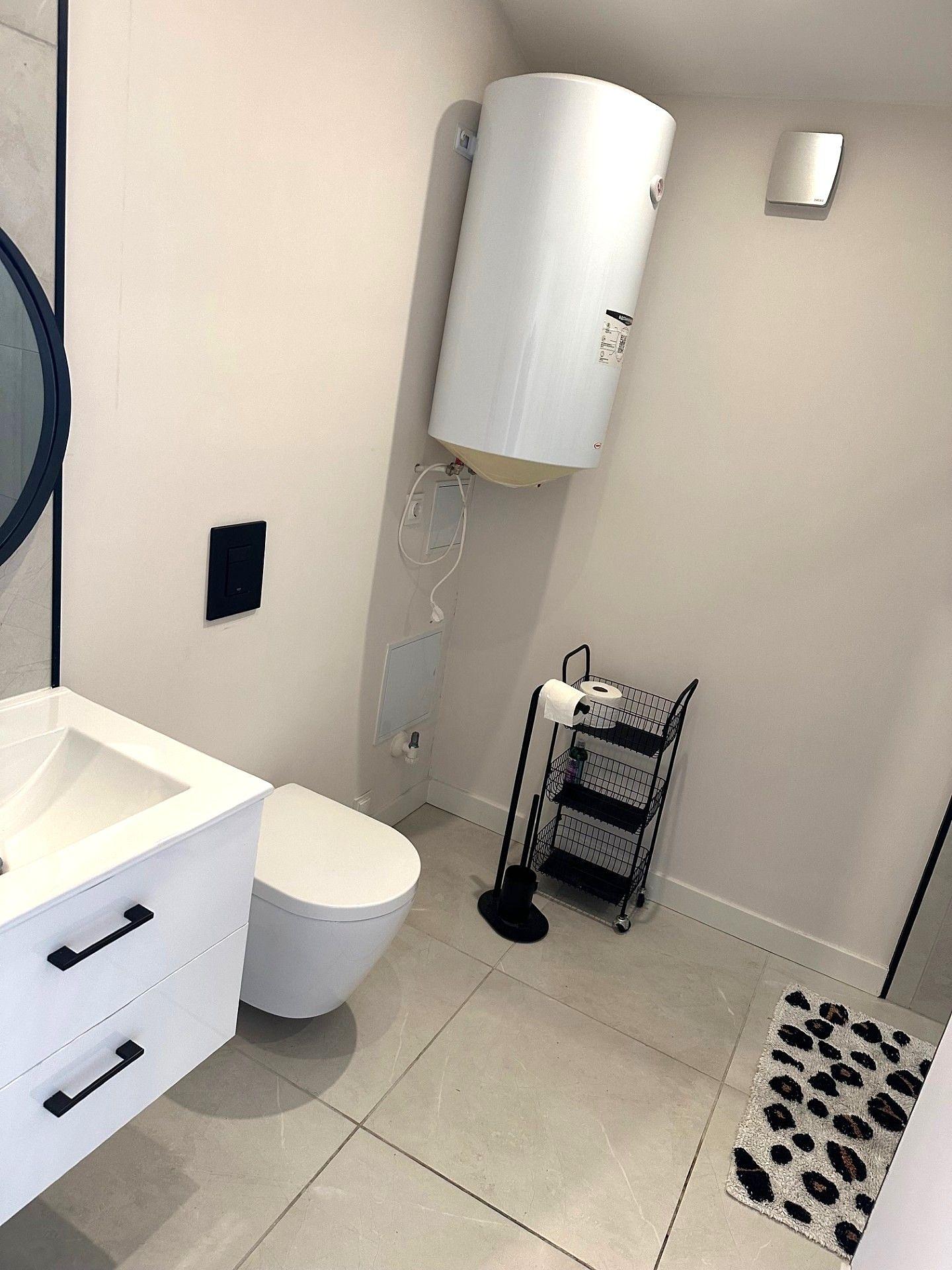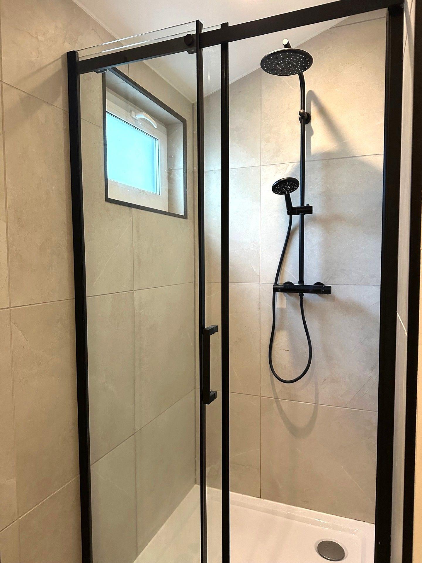 De badkamer is voorzien van een douche, toilet, wastafel met meubel en spiegel, mechanische ventilatie en een kiepraam.