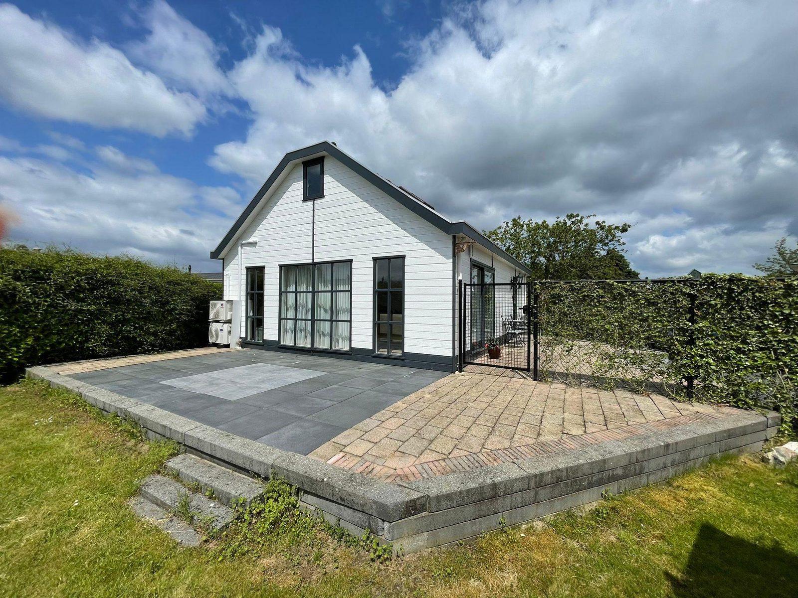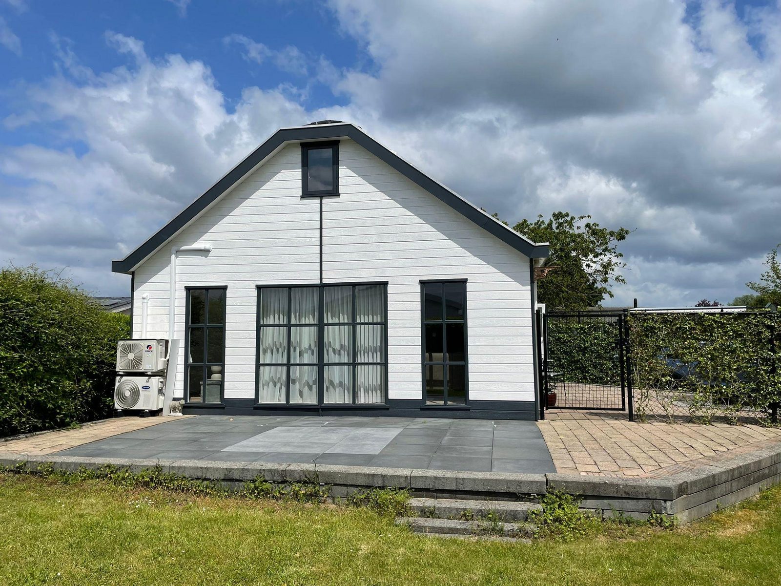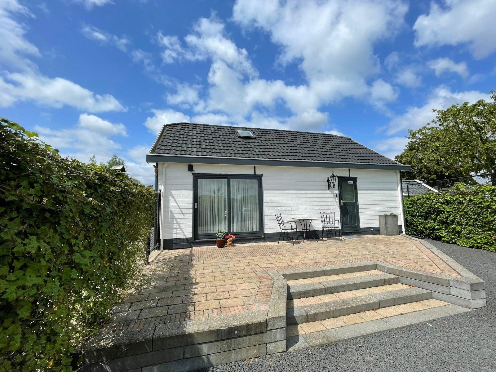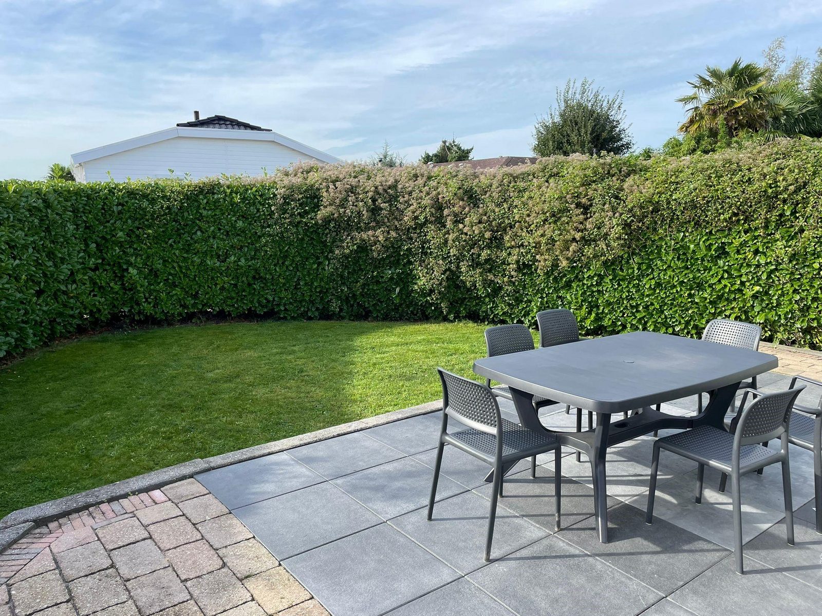 De zeer riante tuin heeft een ruim terras aan de entreezijde met 2 privé parkeerplaatsen. Aan de voorzijde van het vakantiehuis is er een ruime tuin die door een hoge heg is omringt. Hier kunt u in alle rust en met veel privacy even lekker genieten van u welverdiende vakanties en/of vrije dagen.