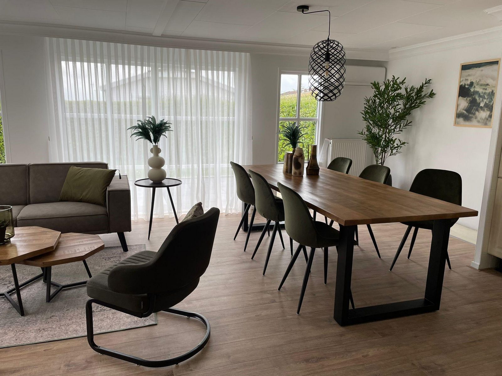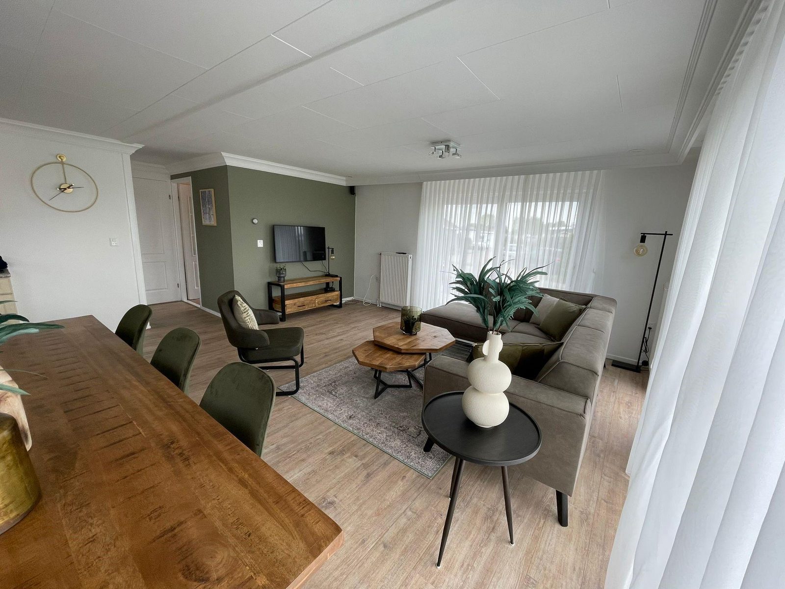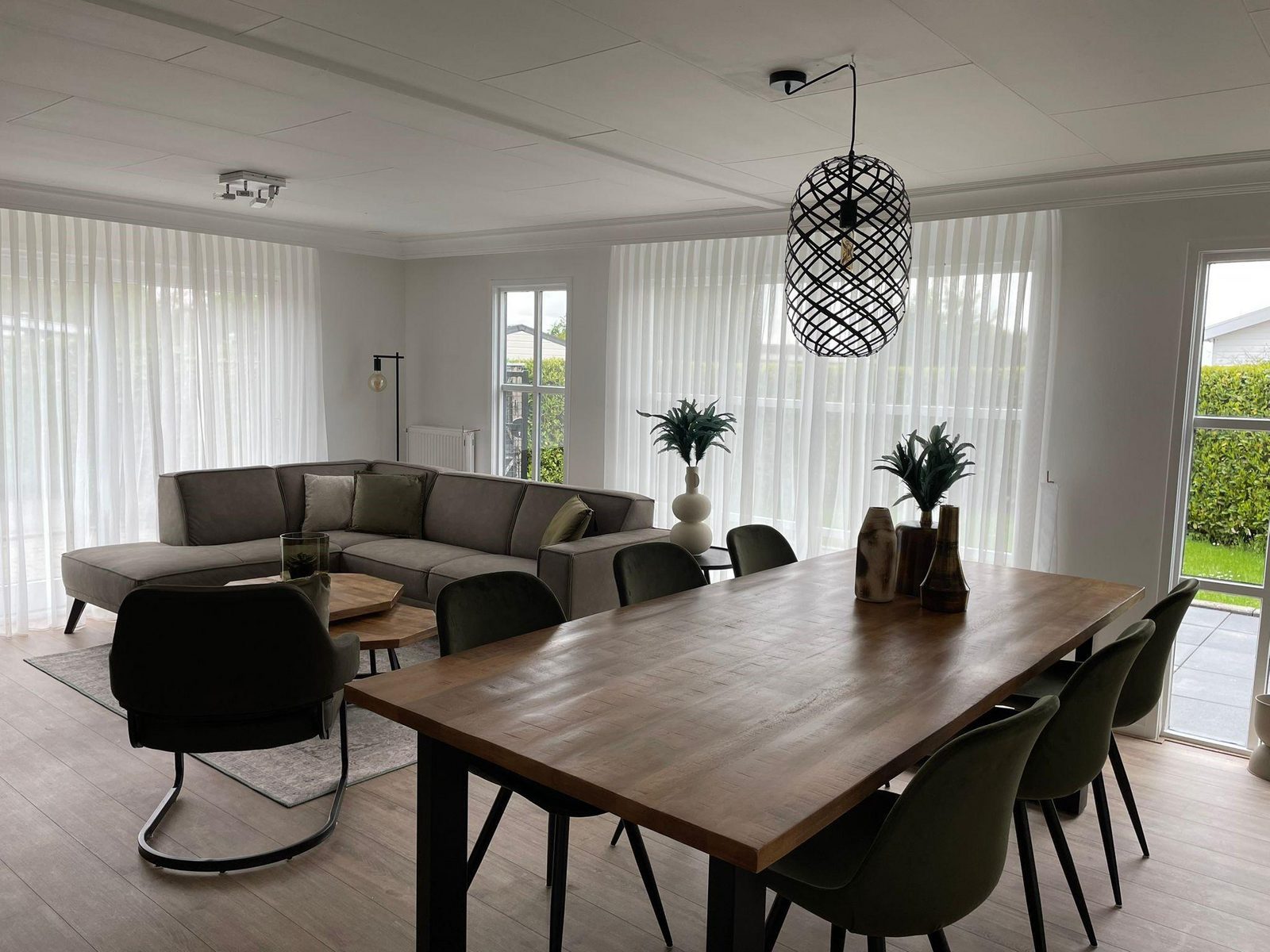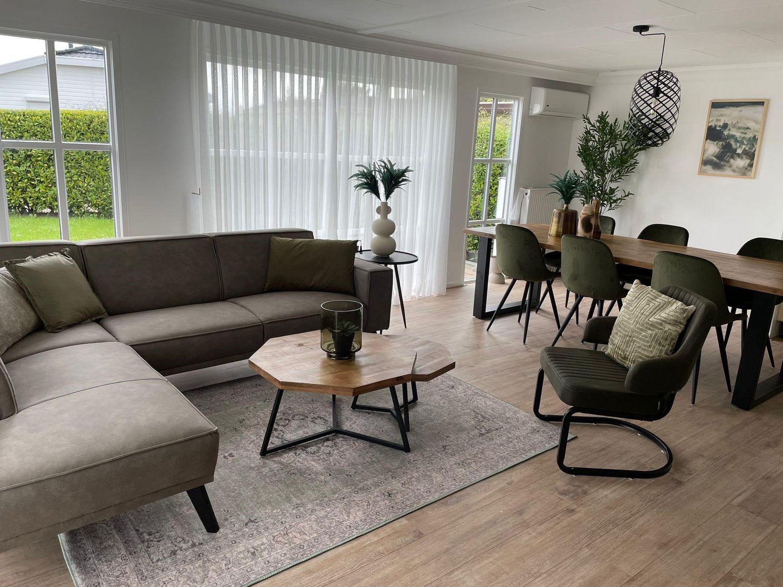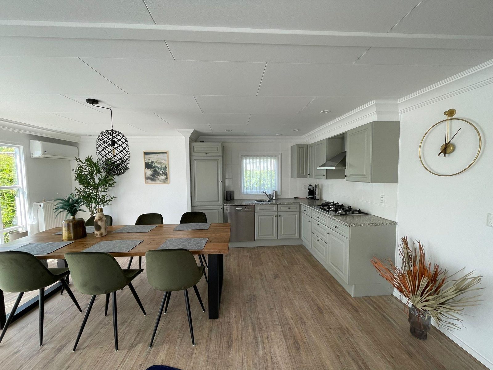 De royale woonkamer is voorzien van een airco en heeft een open eet en woongedeelte. Het vakantiehuis heeft grote raampartijen waardoor het extra ruimtelijk aan voelt, maar zorgt natuurlijk ook voor veel lichtinval en het geeft natuurlijk een prachtig mooi uitzicht over de tuin. Doormiddel van dubbel openslaande terrasdeuren loopt u zo vanuit de woonkamer uw terras op, waar u heerlijk kunt genieten van uw eigen plekje op het park.