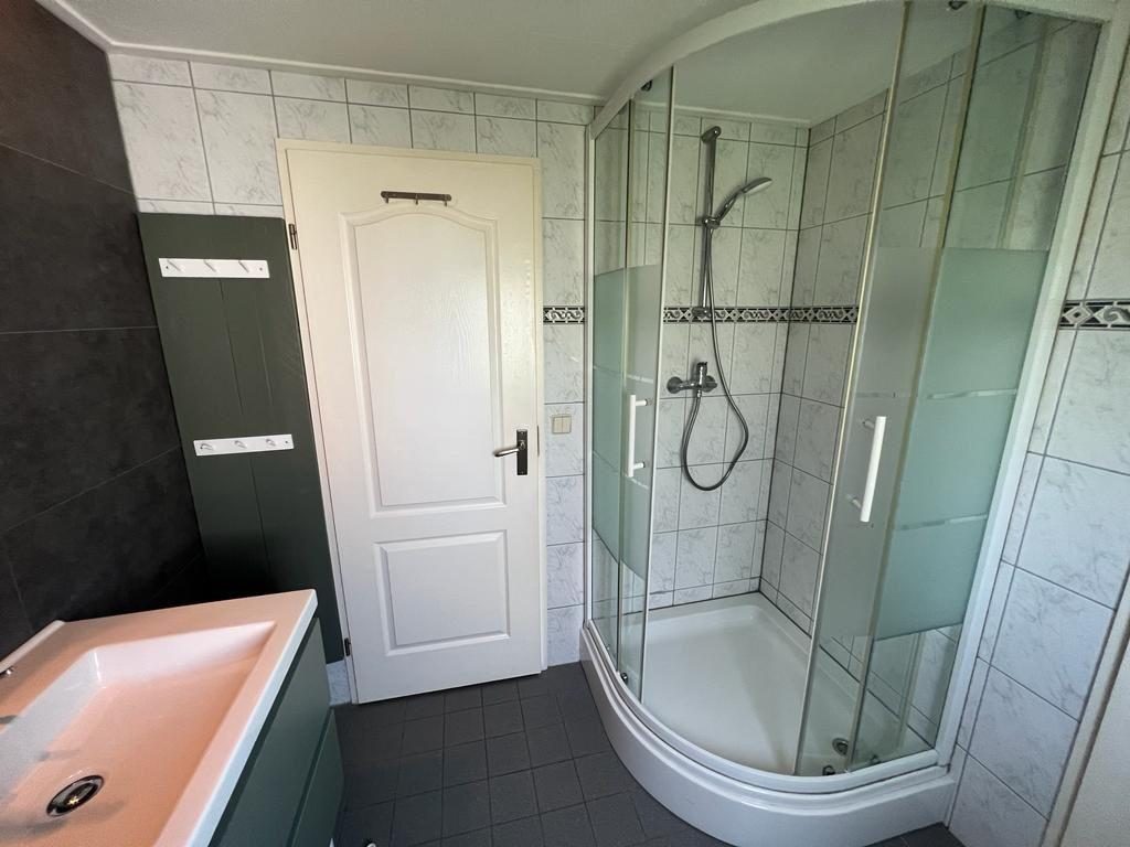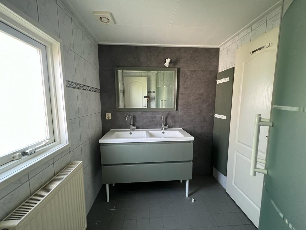 De riante en volledig betegelde badkamer is voorzien van een douche, dubbele wastafel met meubel en een spiegel, mechanische ventilatie en een kiepkozijn.