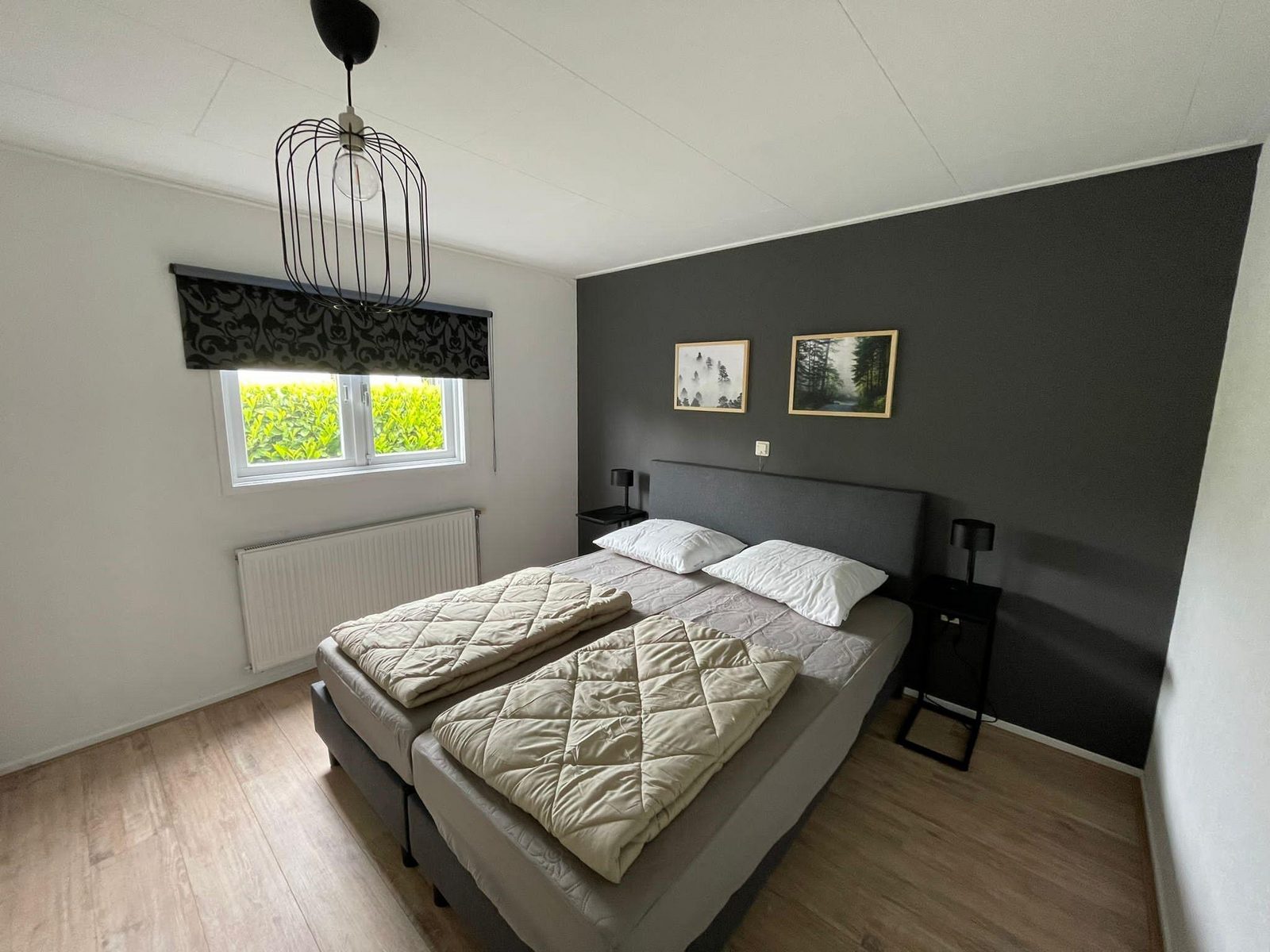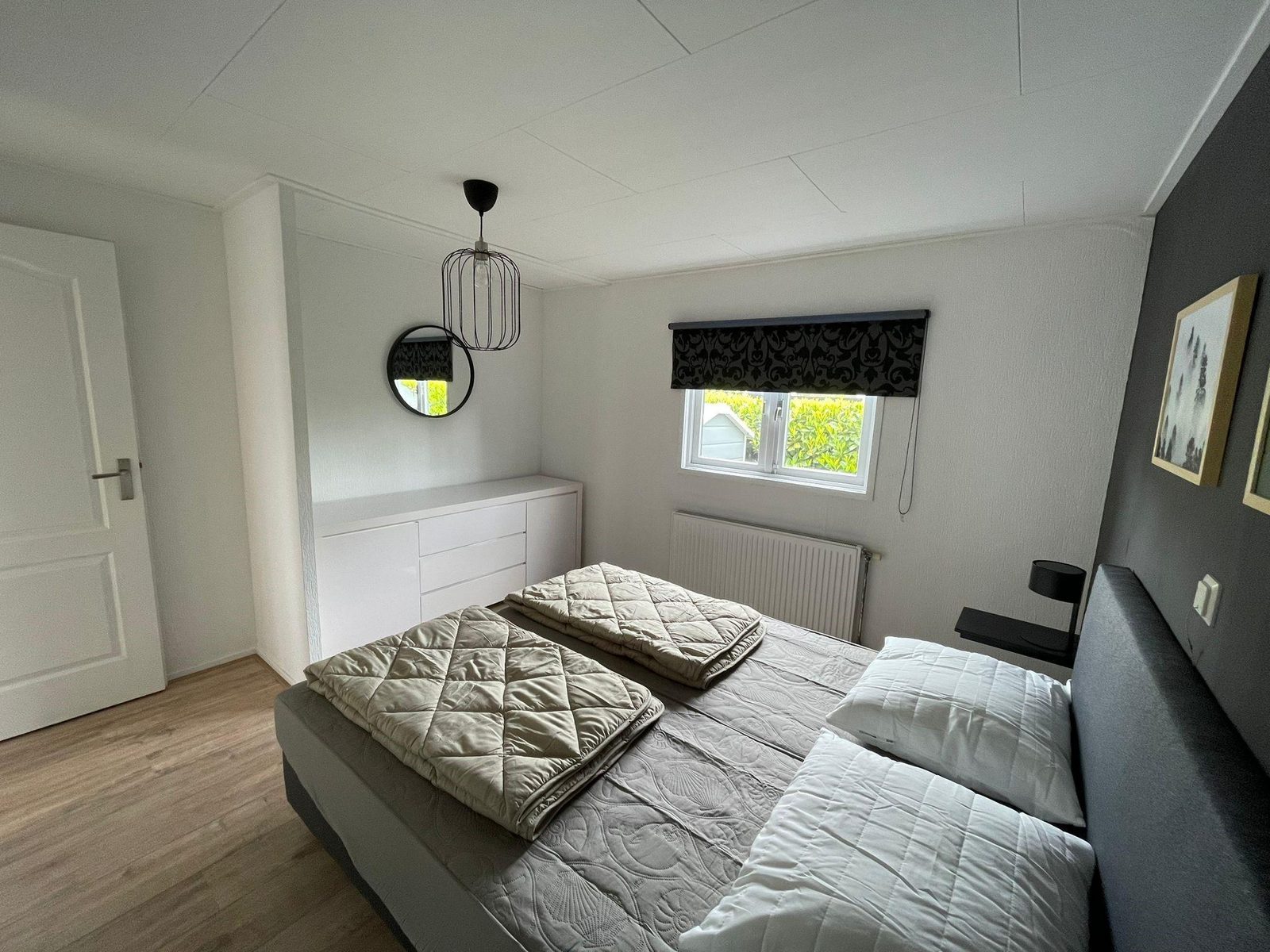 De derde ruime slaapkamer heeft een ruim tweepersoons (boxspring) bed, draai/kiep kozijn met ventilatieroosters, nachtkastje.