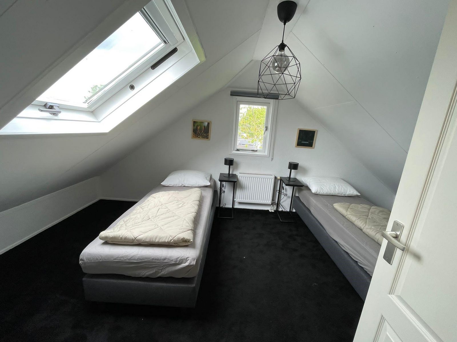 de tweede ruime slaapkamer heeft twee tweepersoons (boxspring) bed, draai/kiep kozijn met ventilatieroosters, nachtkastje.